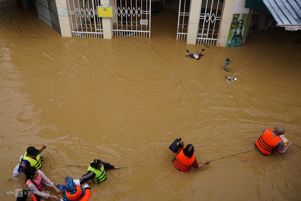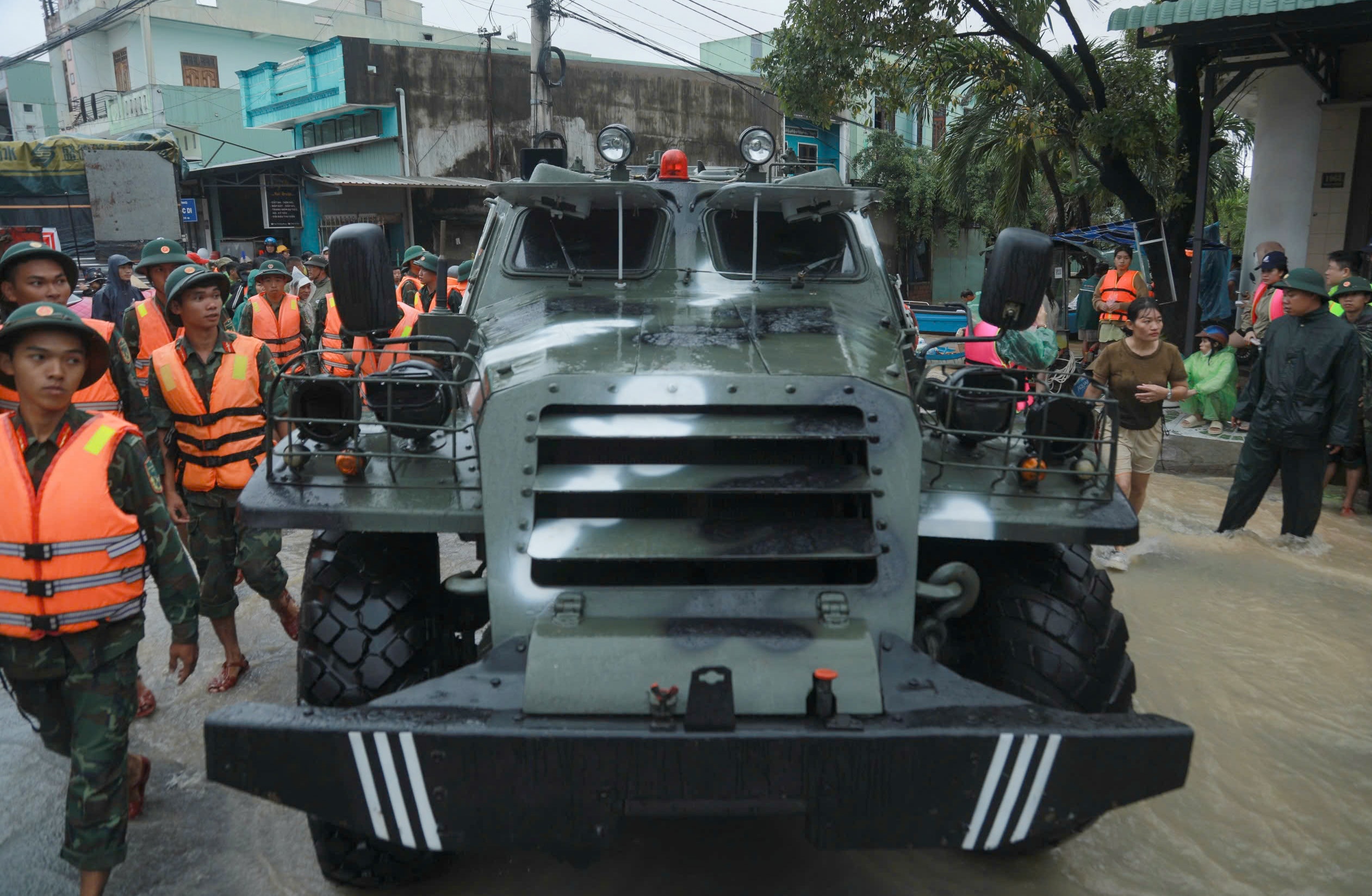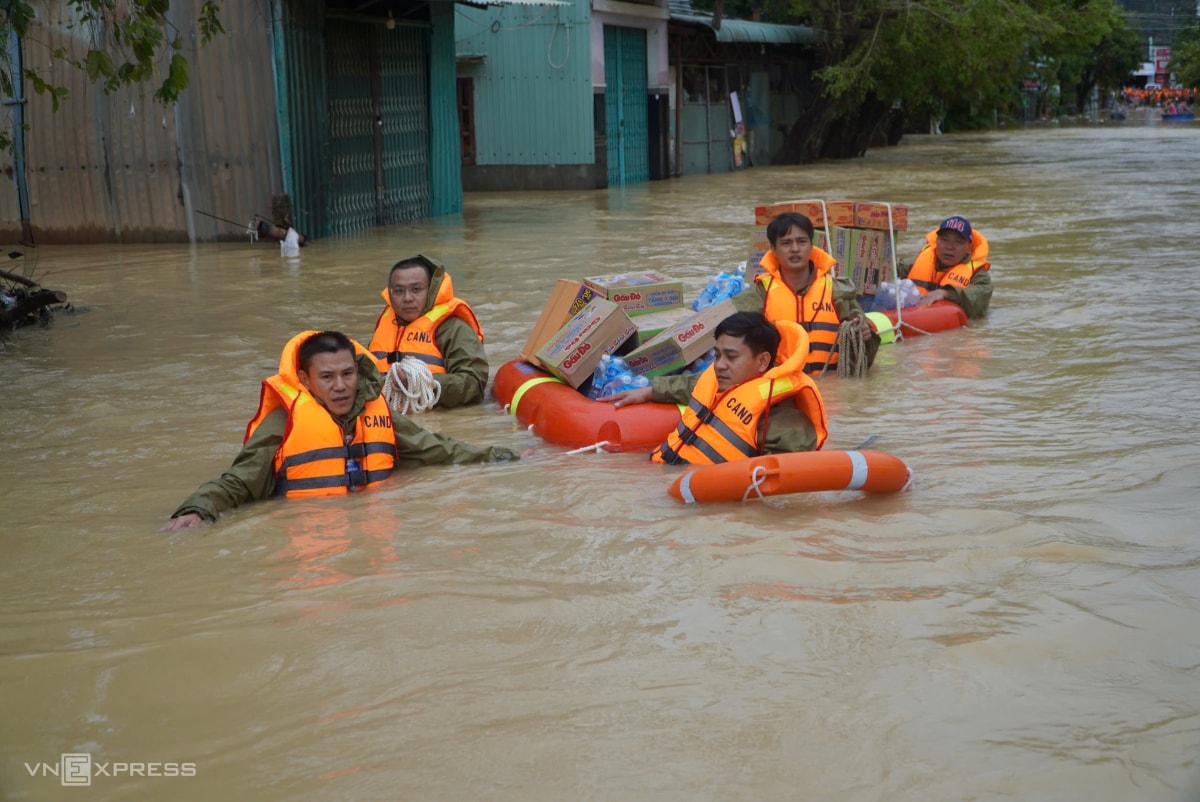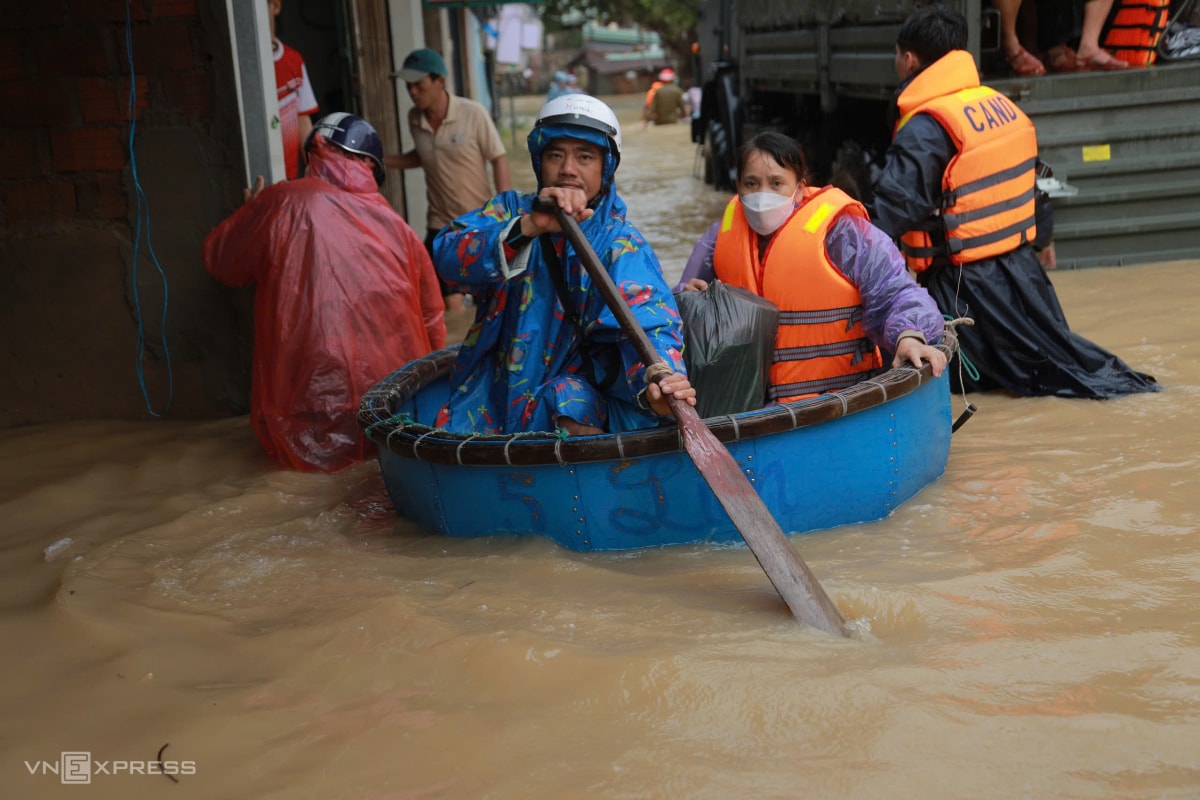 Người dân, lực lượng chức năng ở Nha Trang, Quy Nhơn, bám theo dây dù, thuyền thúng, bè chuối để giải cứu người dân trong vùng ngập, ngày 20/11.