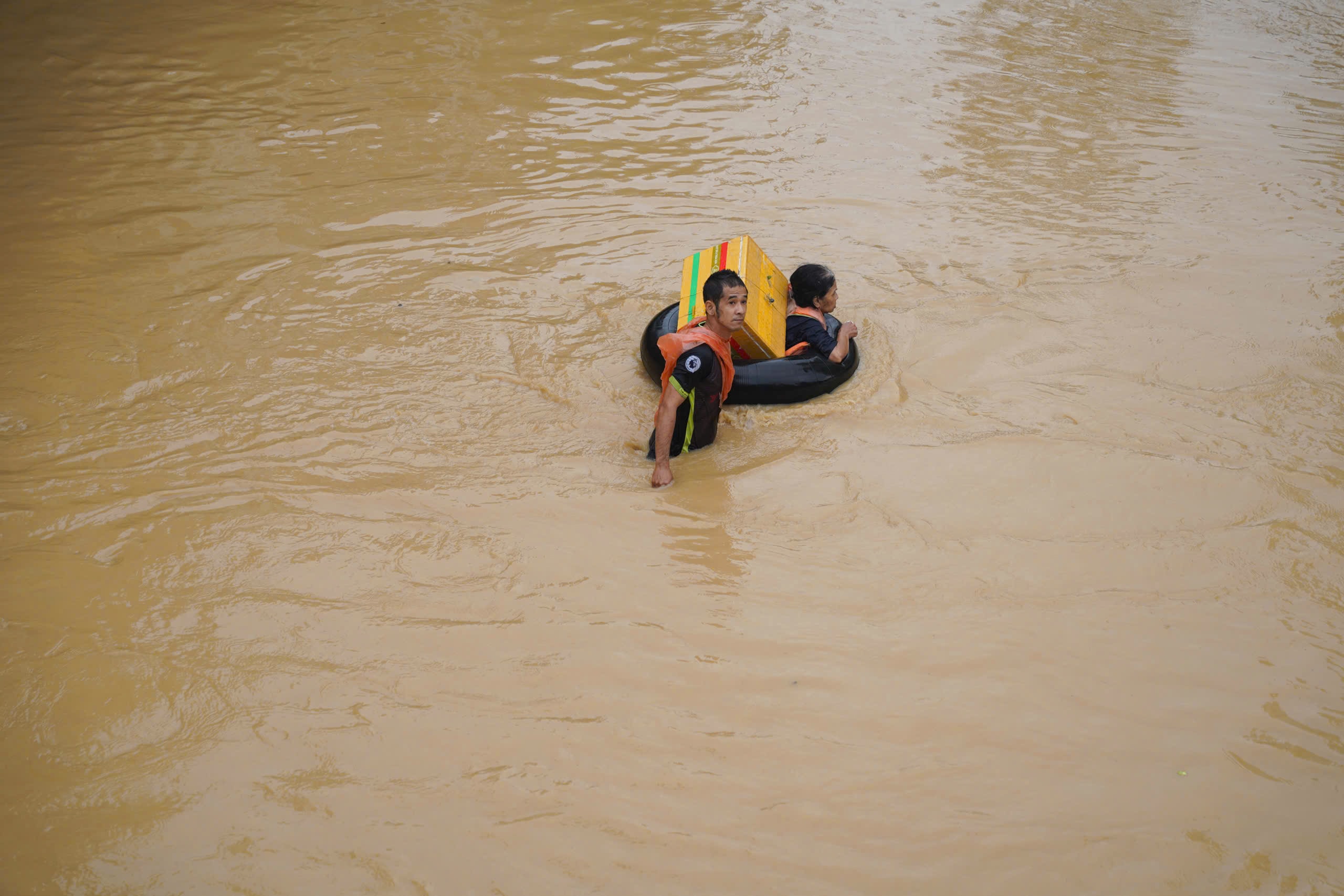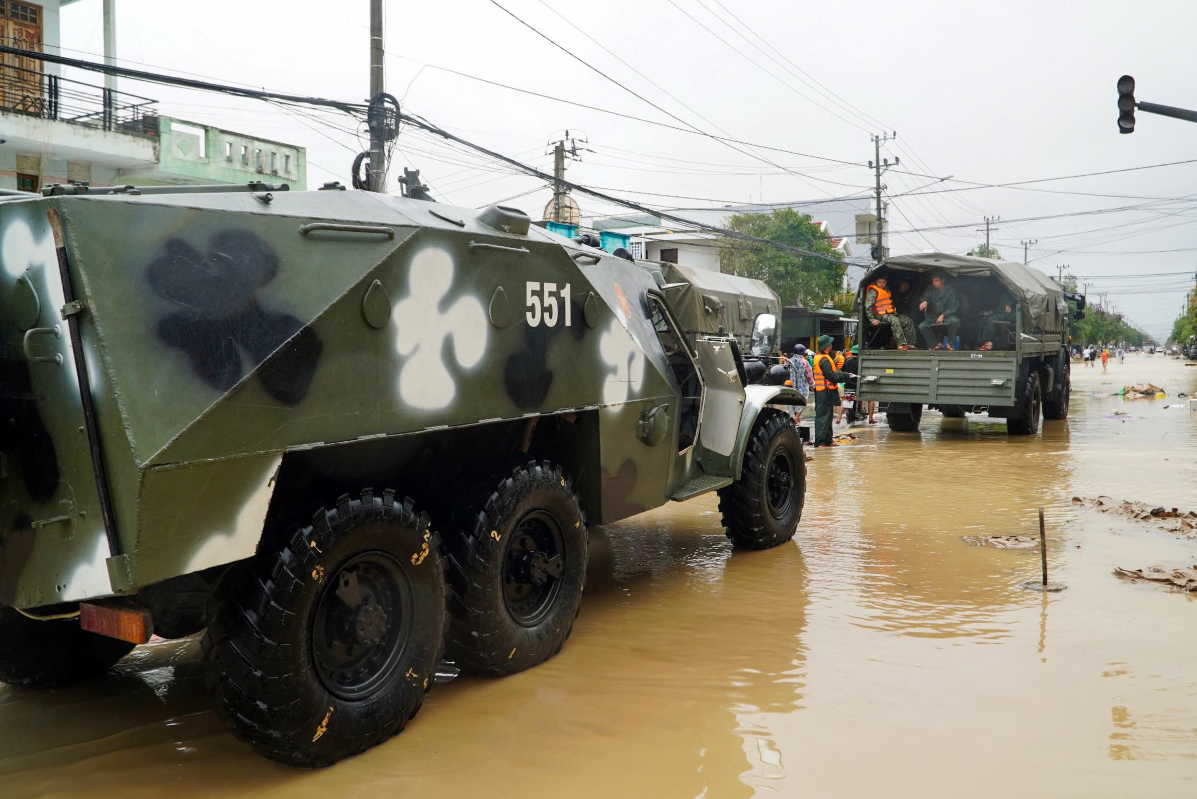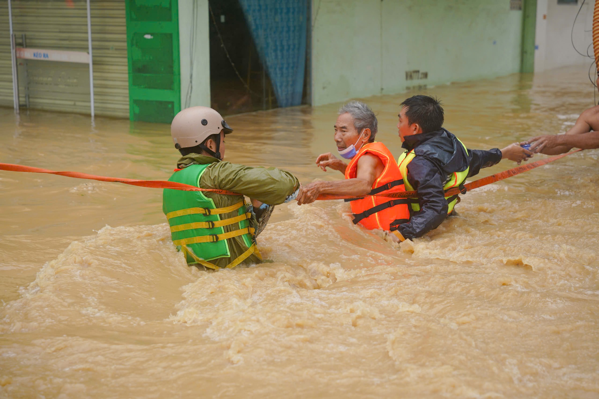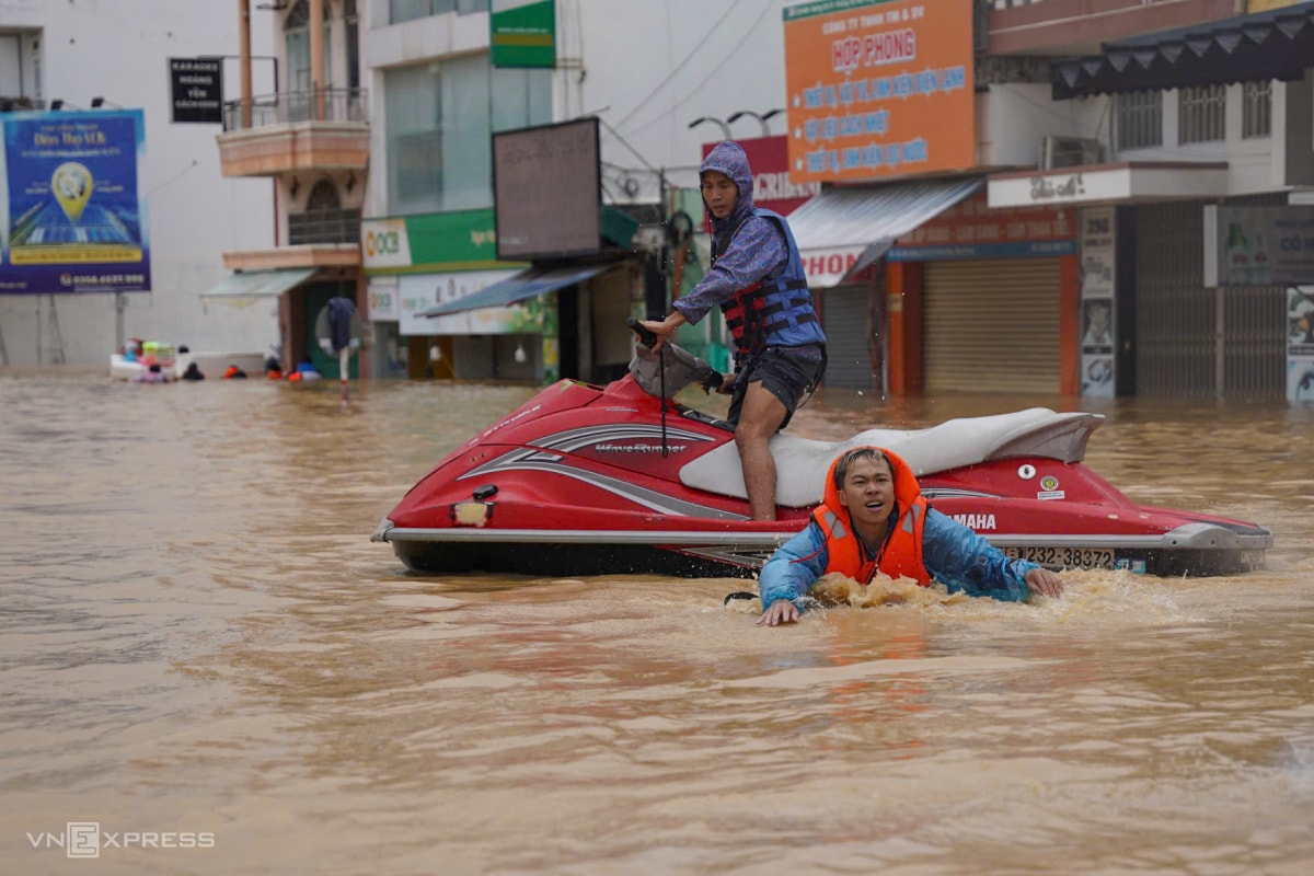 Người dân, lực lượng chức năng ở Nha Trang, Quy Nhơn, bám theo dây dù, thuyền thúng, bè chuối để giải cứu người dân trong vùng ngập, ngày 20/11.