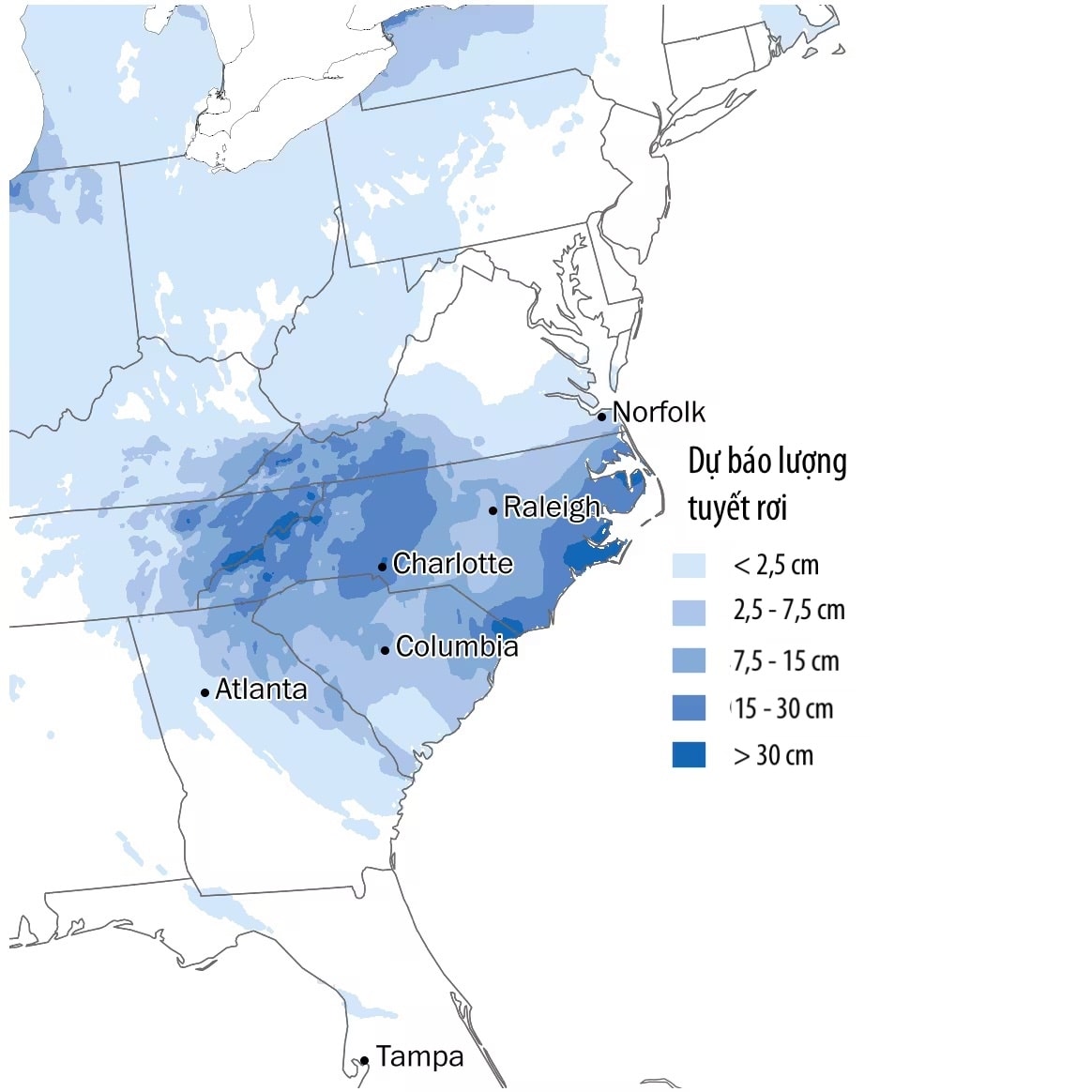 Đợt "bão bom" giữa mùa đông càn quét các bang Mỹ ven Đại Tây Dương, gây băng giá và tuyết rơi nghiêm trọng ở Bắc Carolina.