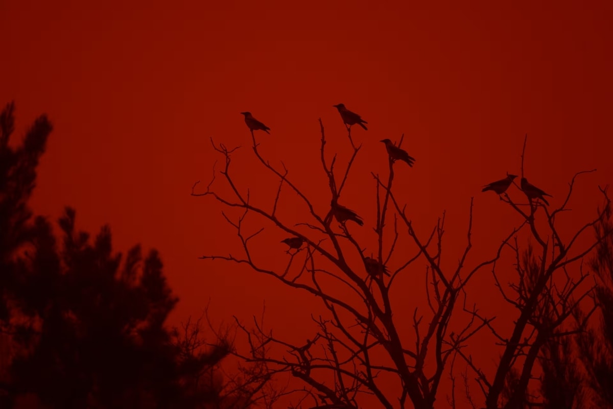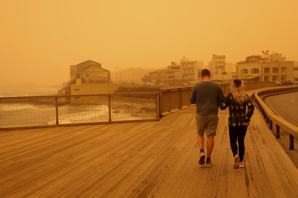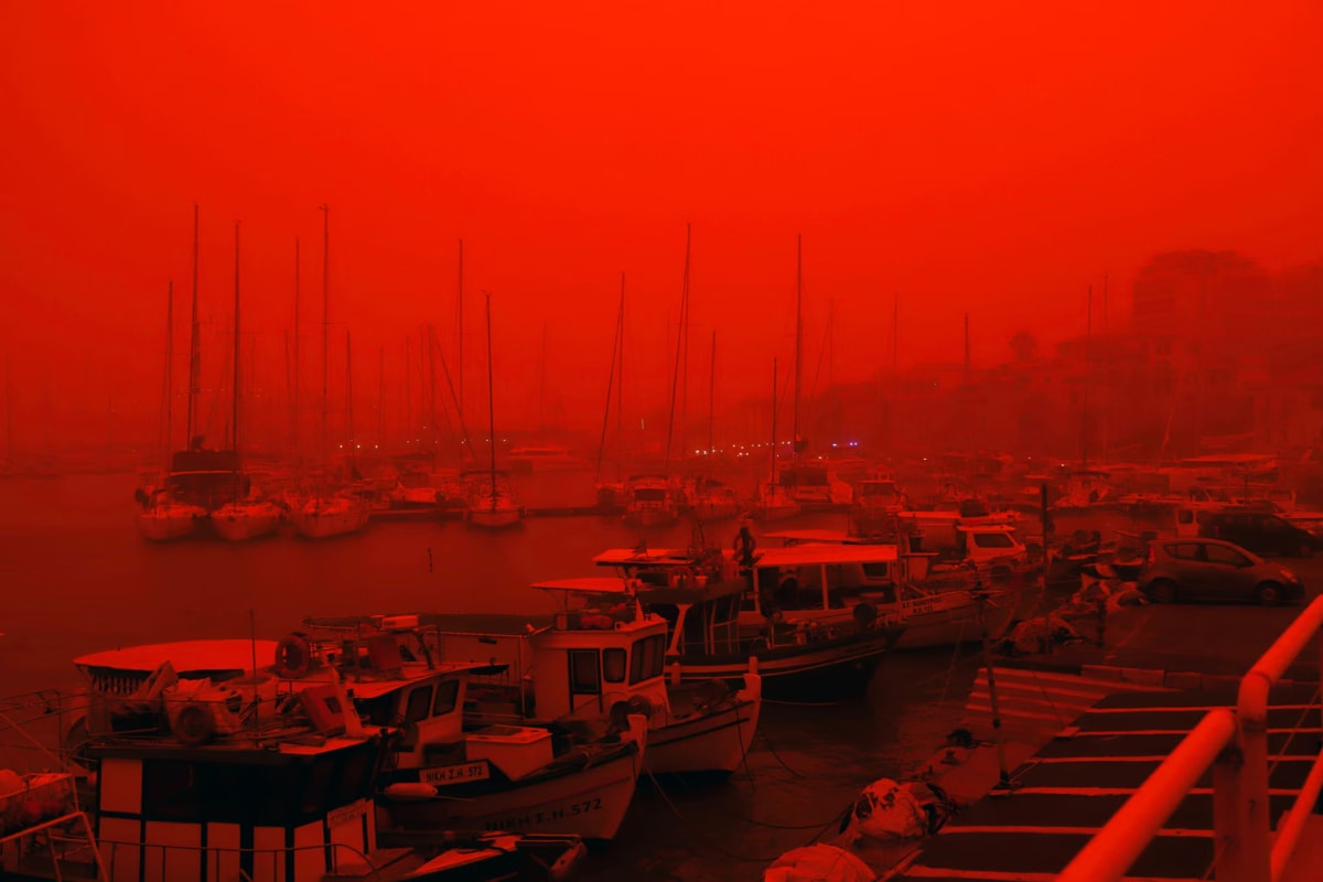 Bầu trời đảo Crete, Hy Lạp chuyển sắc cam, do bị bao phủ bởi lớp bụi mịn khổng lồ thổi từ châu Phi trong hai ngày đầu tháng 4.