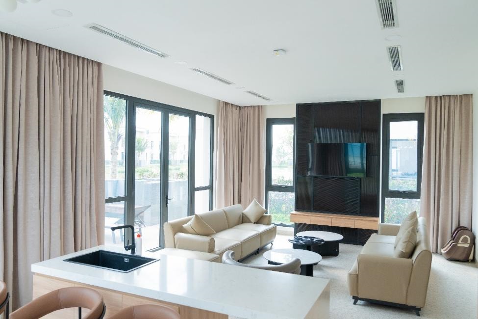 Trong mỗi căn biệt thự, không gian sống được thiết kế đầy đủ tiện nghi với phòng khách, bếp và hệ thống giải trí, mang đến cảm giác như một tổ ấm. Người bệnh và gia đình không chỉ được chăm sóc y tế, mà còn tận hưởng không gian sống sang trọng, riêng tư, hòa mình với thiên nhiên suốt hành trình hồi phục. Ảnh: Vinmec