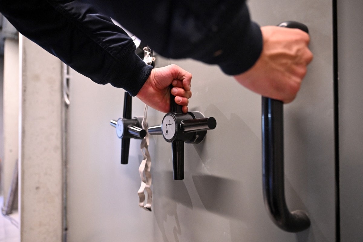 Nhân viên kéo cánh cửa thép nặng hơn 4 tấn, dẫn vào kho dự trữ đất hiếm lớn nhất nước Đức trong một boongke có từ thời Thế chiến II tại Frankfurt am Main, miền tây đất nước, ngày 4/11.