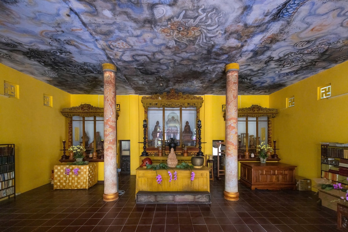 Bên trong chánh điện nổi bật với bức bích họa Long vân khế hội (còn gọi là Cửu long ẩn vân). Tác phẩm khắc họa năm con rồng ẩn hiện giữa mây trên trần điện và bốn con rồng uốn lượn trên bốn cột trụ nội điện. Bức tranh được vẽ khi chùa được xây dựng lại sau năm 1953, theo phong cách bích họa cung đình, gợi liên tưởng đến họa tiết rồng trên trần lăng vua Khải Định.