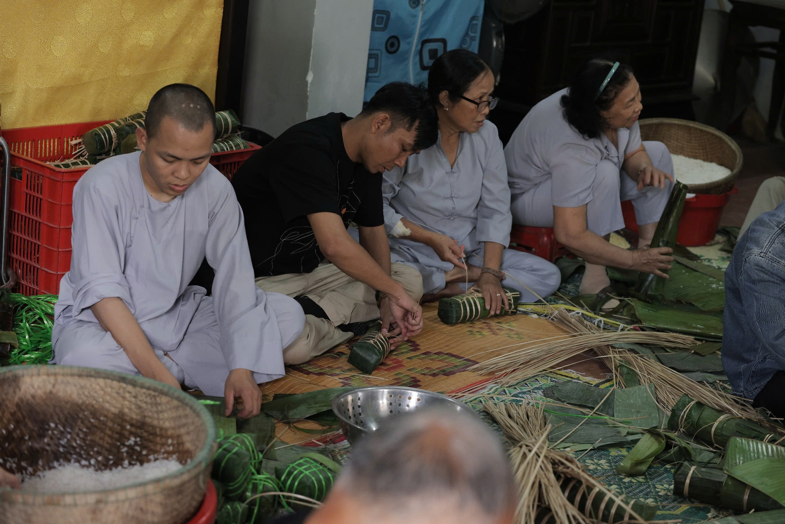 Tăng ni, Phật tử và người dân địa phương cùng quây quần bên sân chùa, chuẩn bị lá dong, nếp, đậu xanh, để gói hàng trăm chiếc bánh. Số bánh sau khi hoàn tất được dâng cúng và chia sẻ đến các hoàn cảnh khó khăn trên địa bàn, như một cách lan tỏa tinh thần từ bi và sẻ chia dịp năm mới.