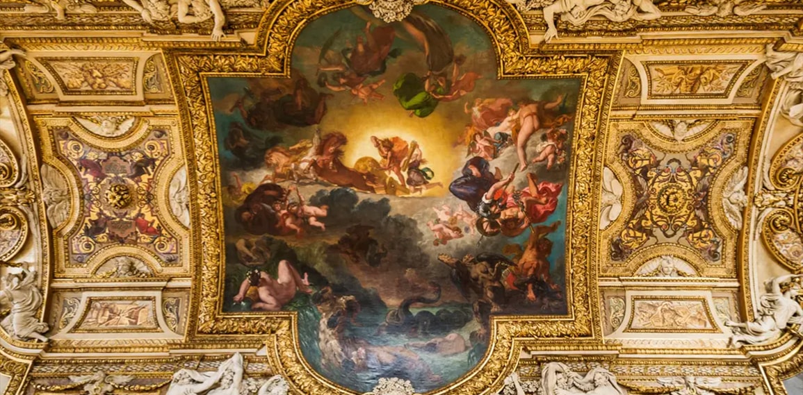 Với phần trang trí chạm khắc và vẽ tay, phòng trưng bày đã khắc họa quyền năng của Mặt Trời bao trùm vũ trụ, đồng thời tôn vinh vinh quang của Vua Mặt Trời - Louis XIV. Ảnh: Louvre
