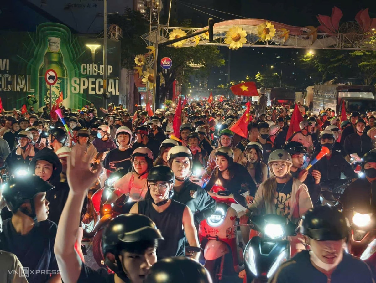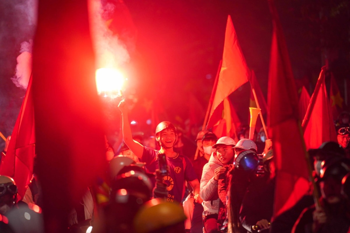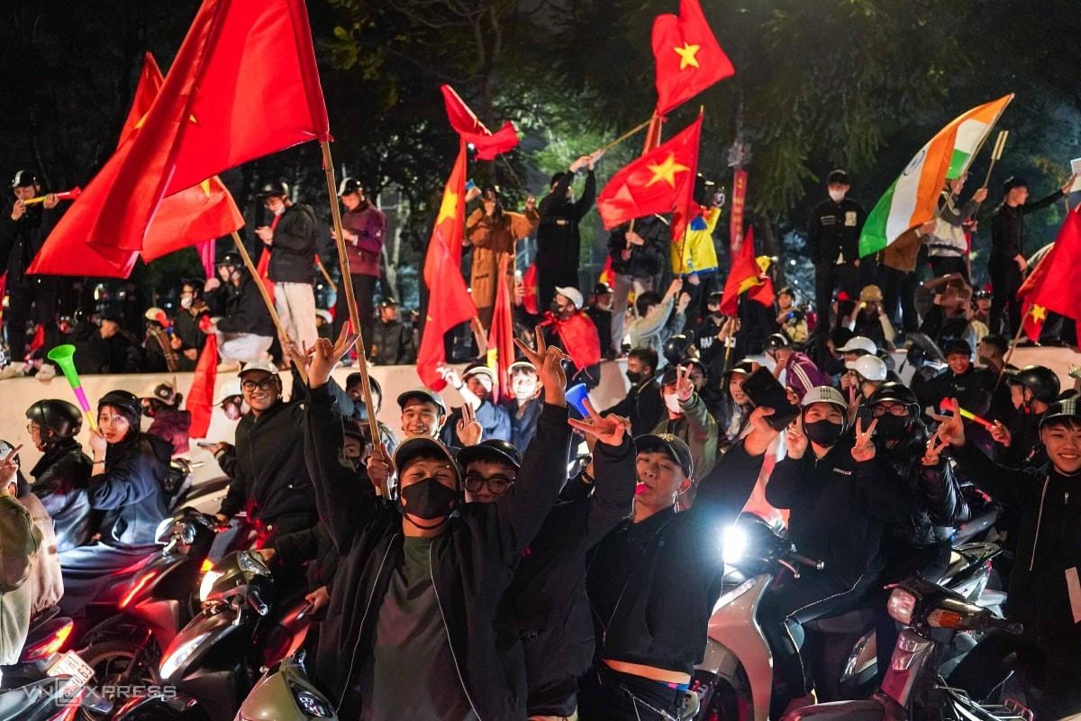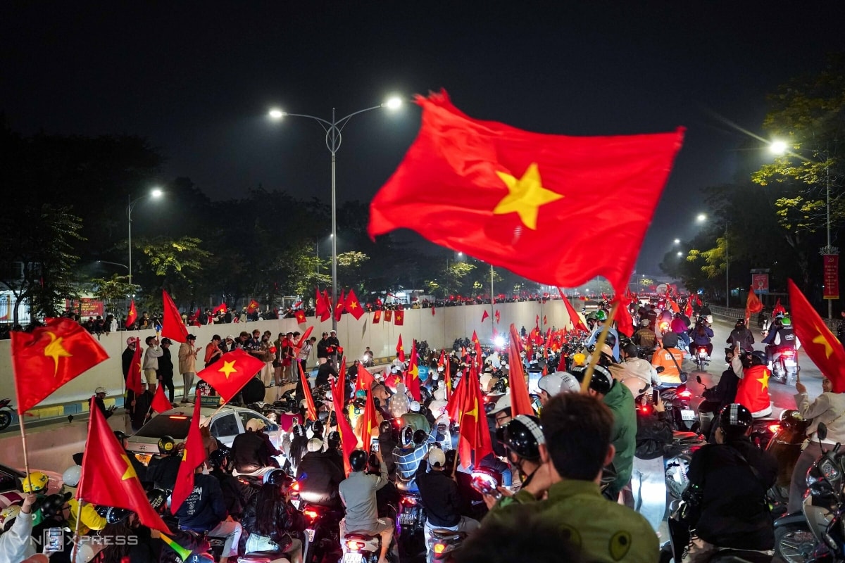 Dù trận đấu Việt Nam – UAE kết thúc vào rạng sáng, người dân Hà Nội và TP HCM vẫn mang cờ đỏ sao vàng đổ ra các tuyến đường trung tâm, ăn mừng đội tuyển lần thứ hai vào bán kết U23 châu Á.