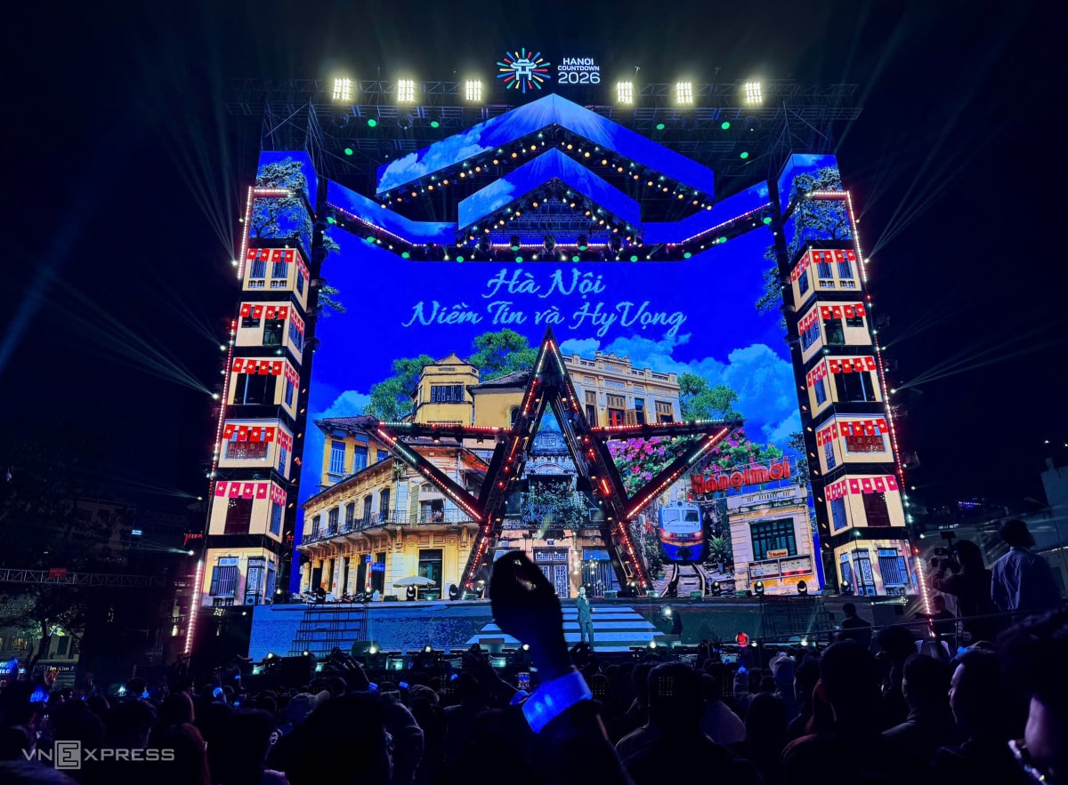 Sân khấu chương trình chào đón năm 2026 đầy màu sắc, nhiều tiết mục âm nhạc trình diễn tại quảng trường Đông Kinh Nghĩa Thục.