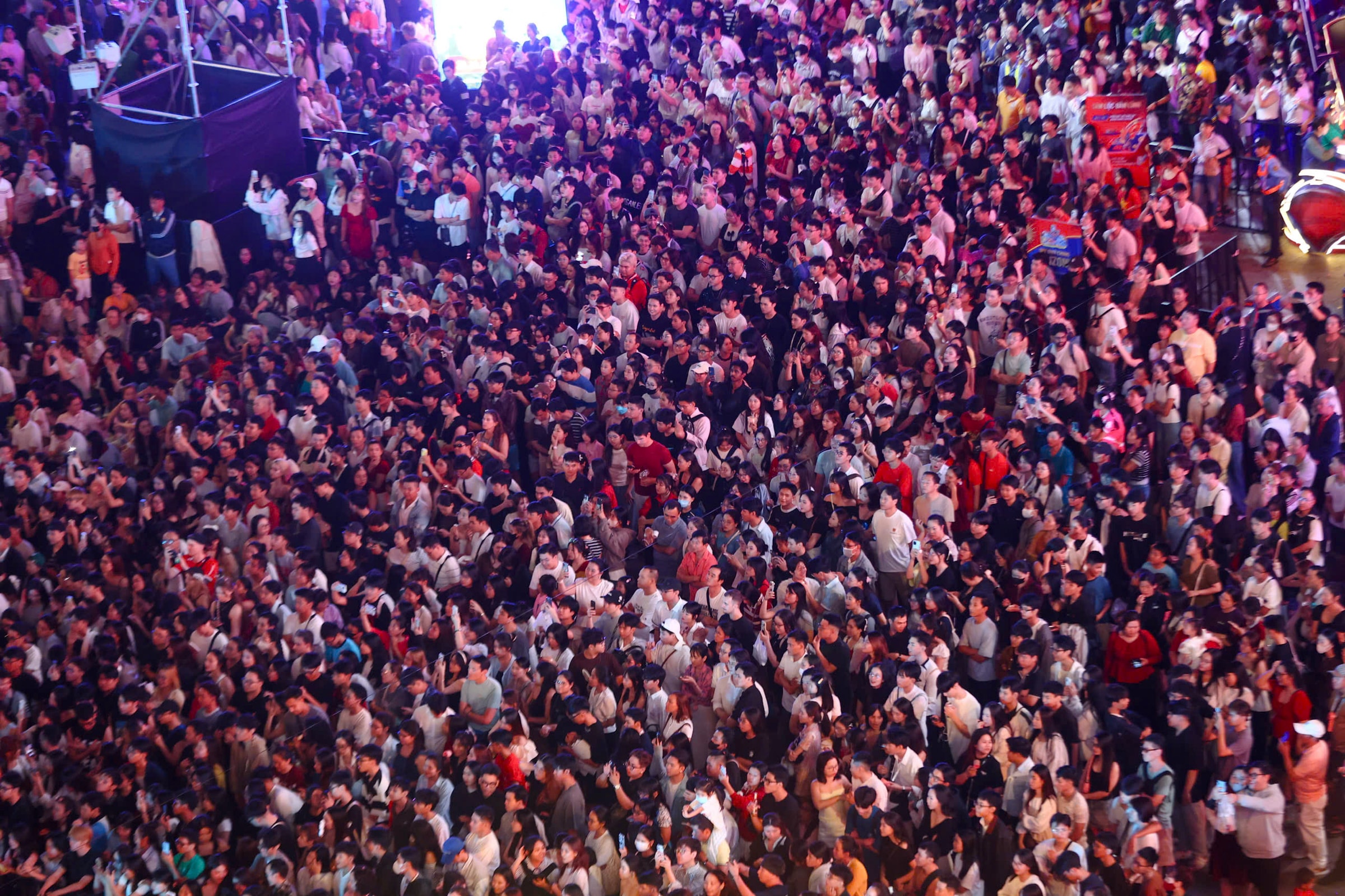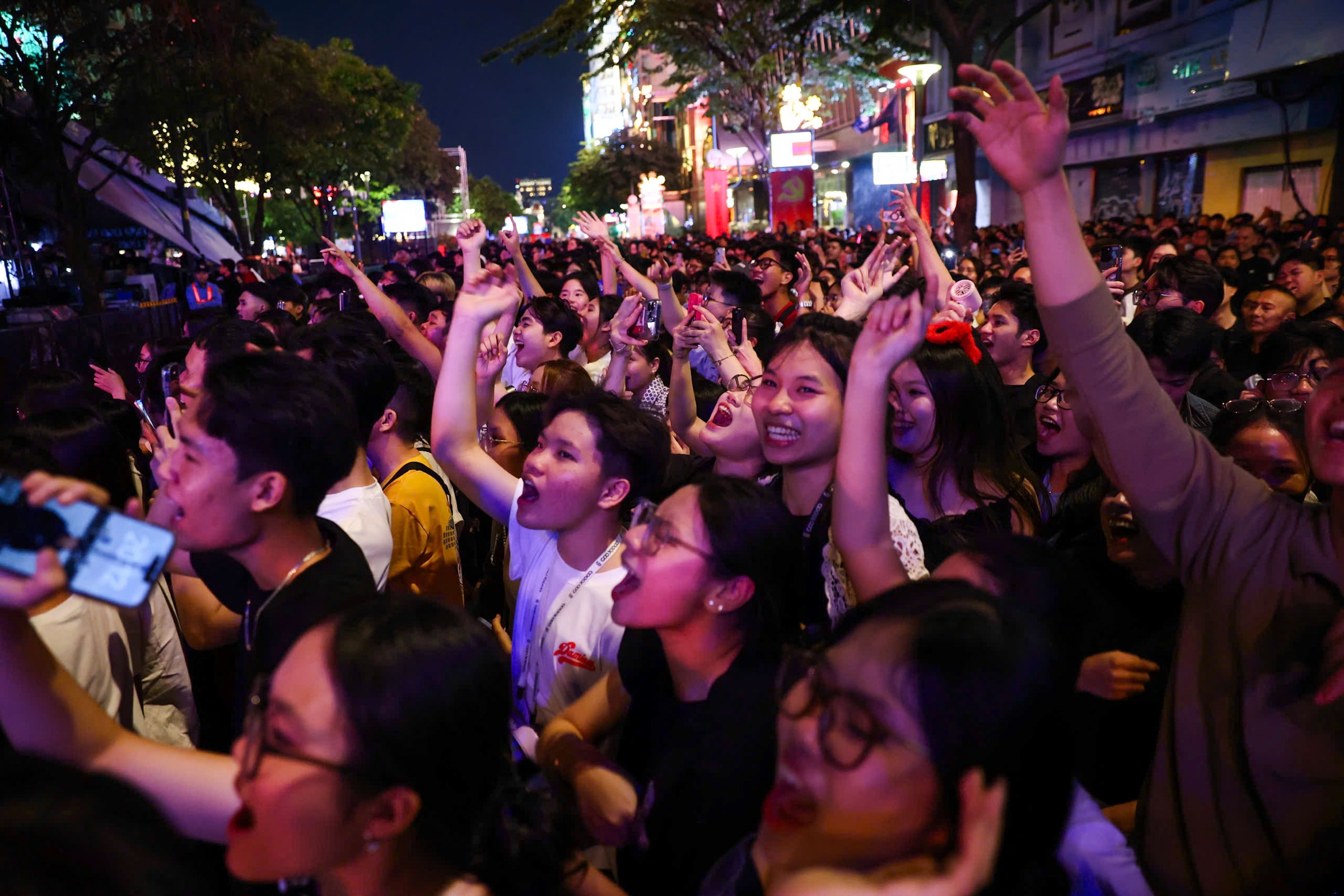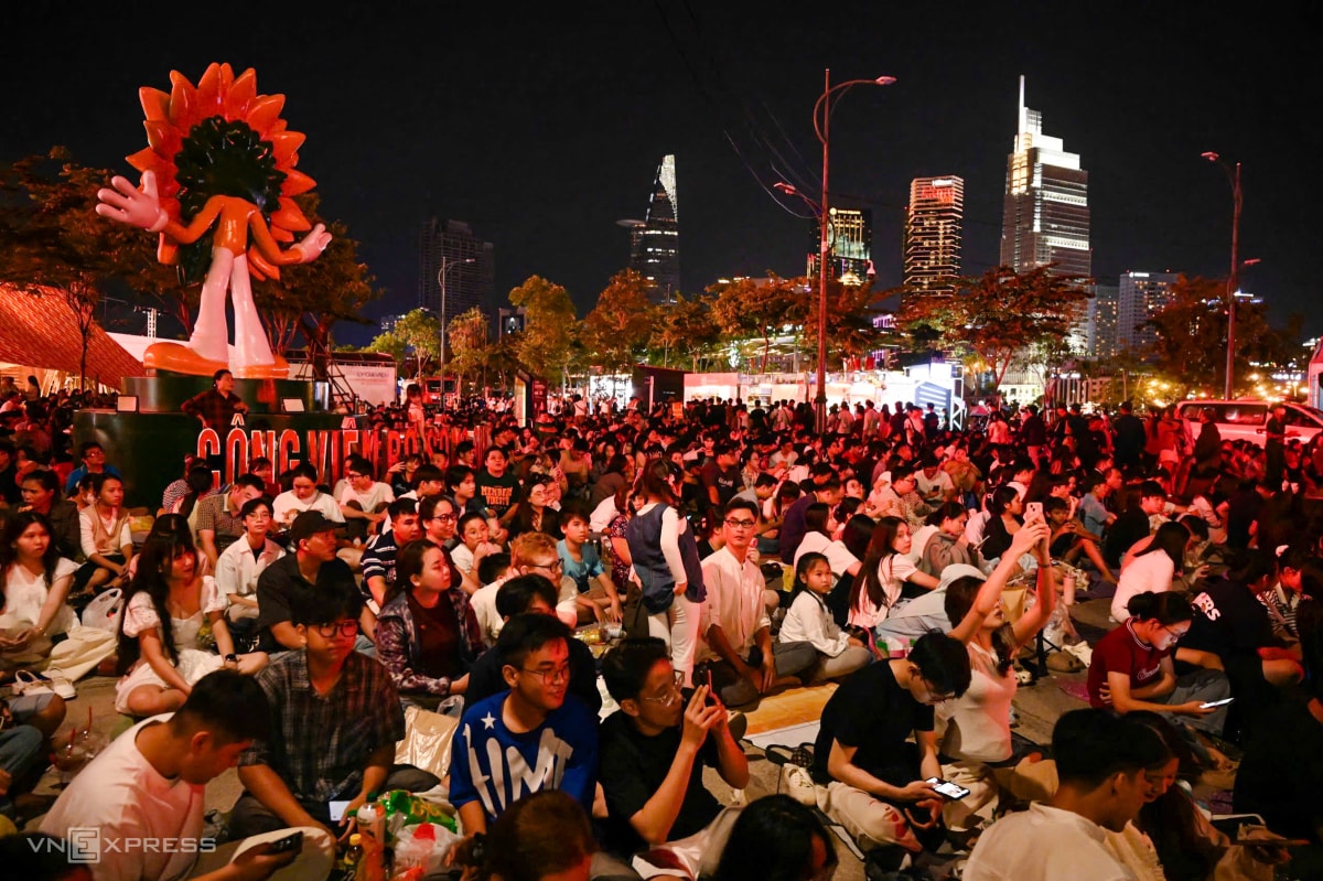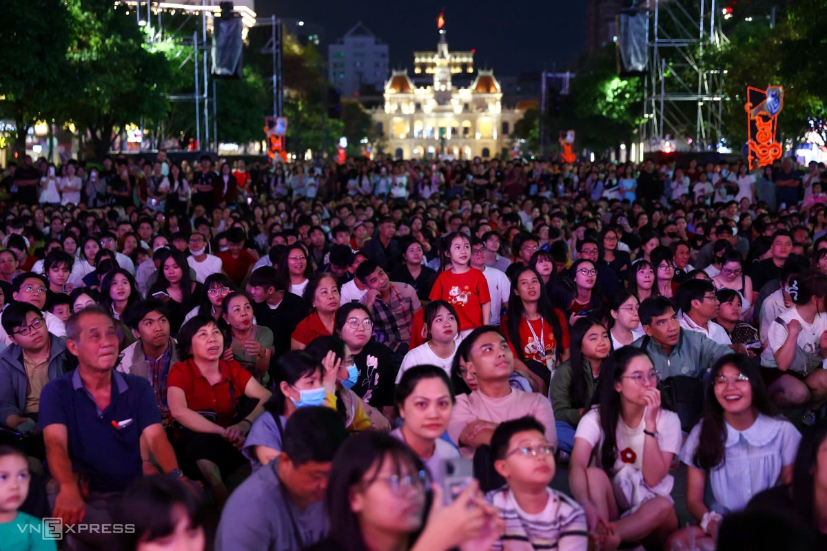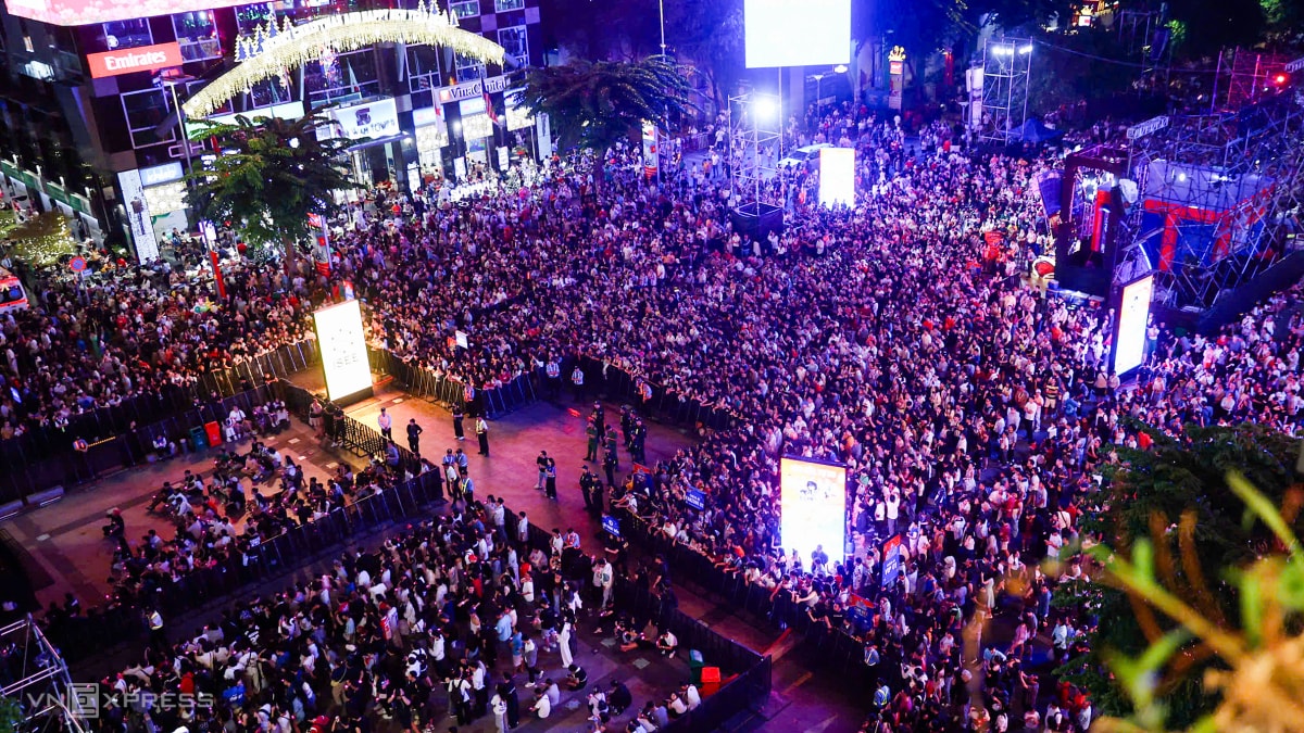 Lúc 21h, khoảng 500 m trên phố đi bộ Nguyễn Huệ, TP HCM gần như không còn chỗ trống khi hàng nghìn người đổ về xem chương trình countdown và pháo hoa chào năm 2026.
