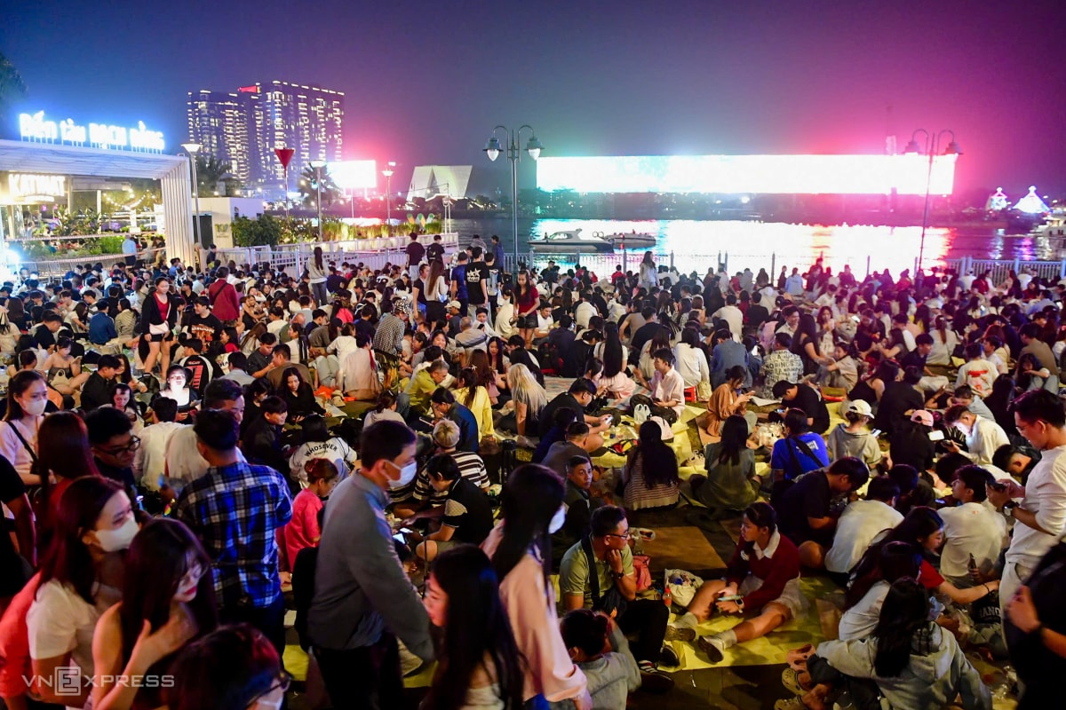 Cách sân khấu countdown khoảng 300 m, khu vực bến bến Bạch Đằng, ven sông Sài Gòn đông nghịt người đổ về "giữ chỗ", chờ xem pháo hoa.