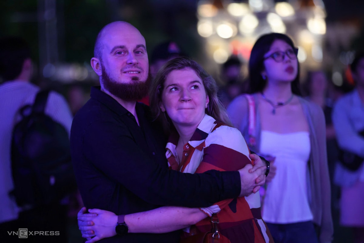 Hai du khách nước ngoài theo dõi chương trình coutdown trên phố đi bộ Nguyễn Huệ.