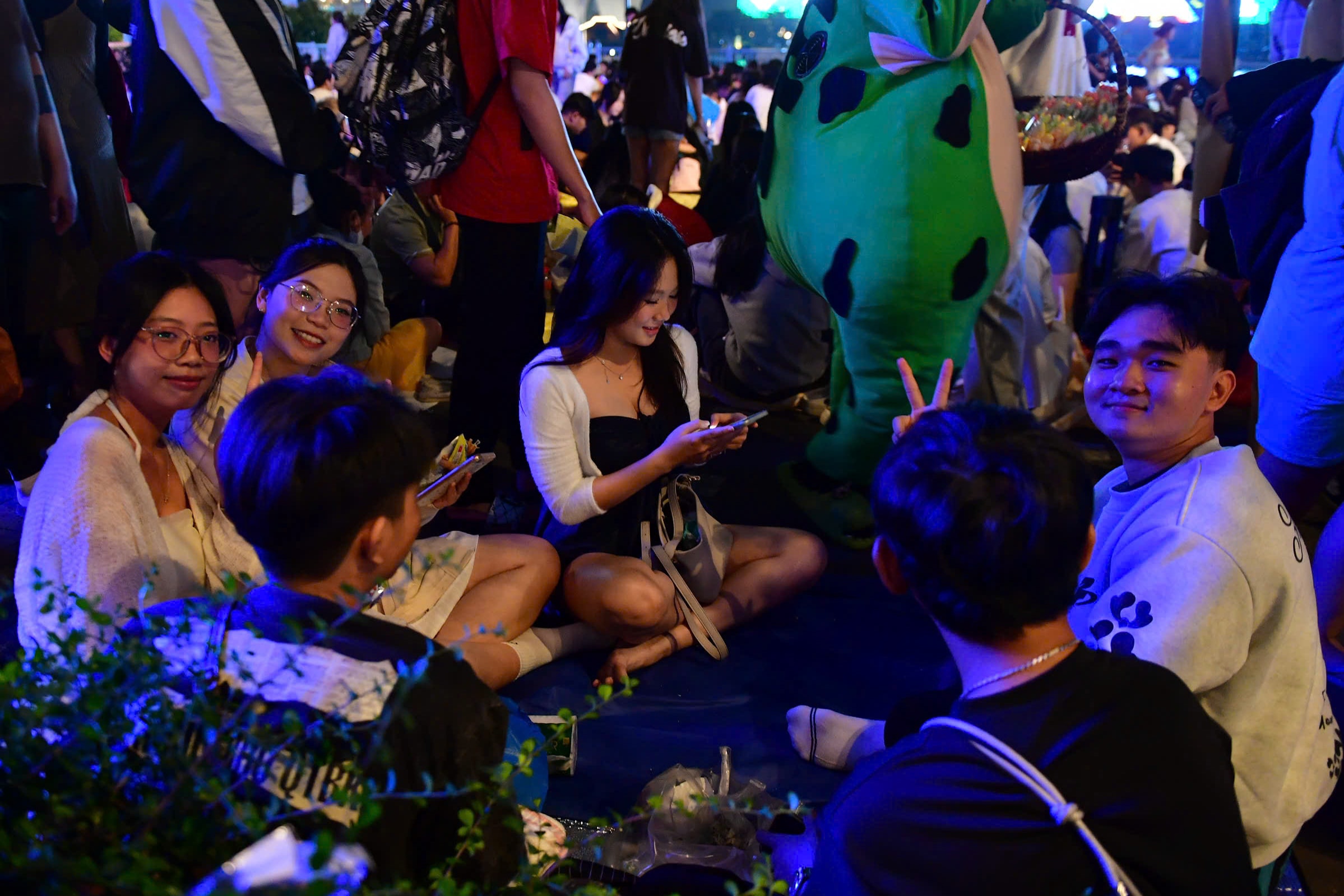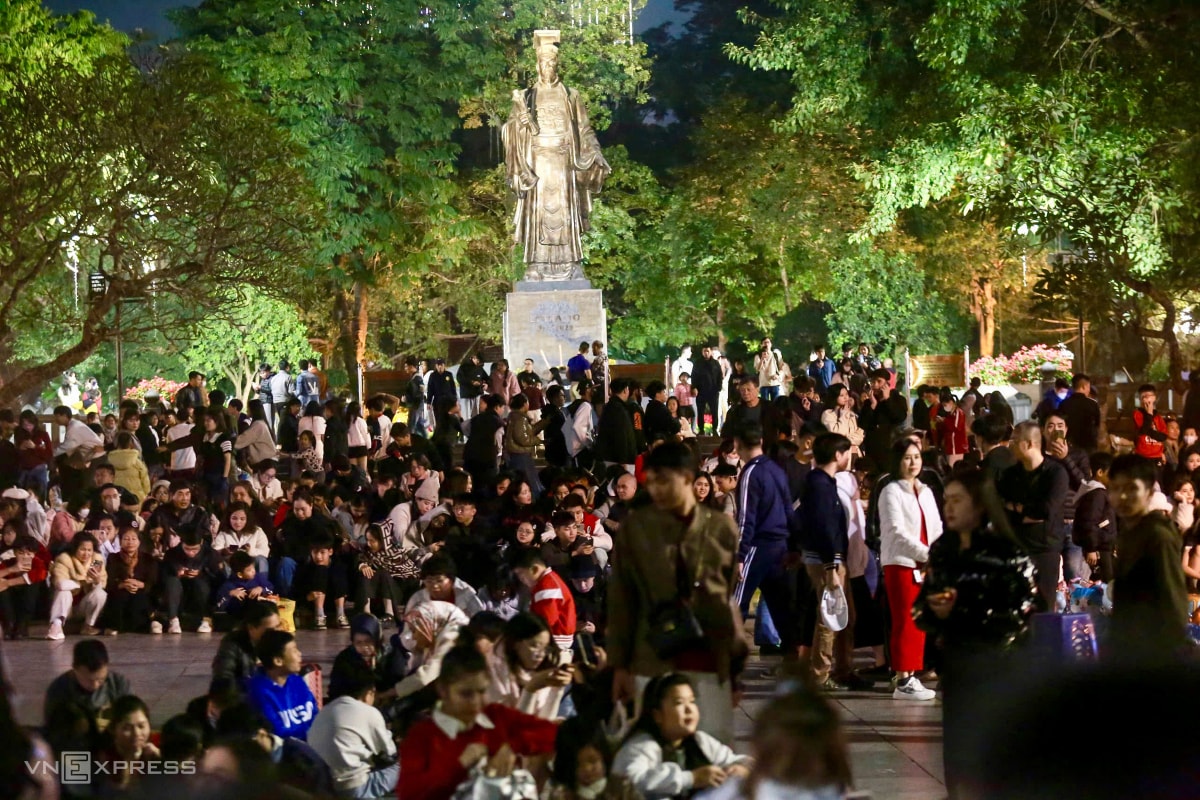 Lúc 21h, phố đi bộ Hồ Gươm chật kín người, khu vực trước tượng tài Lý Thái Tổ đông nghịt người ngồi chờ xem pháo hoa.