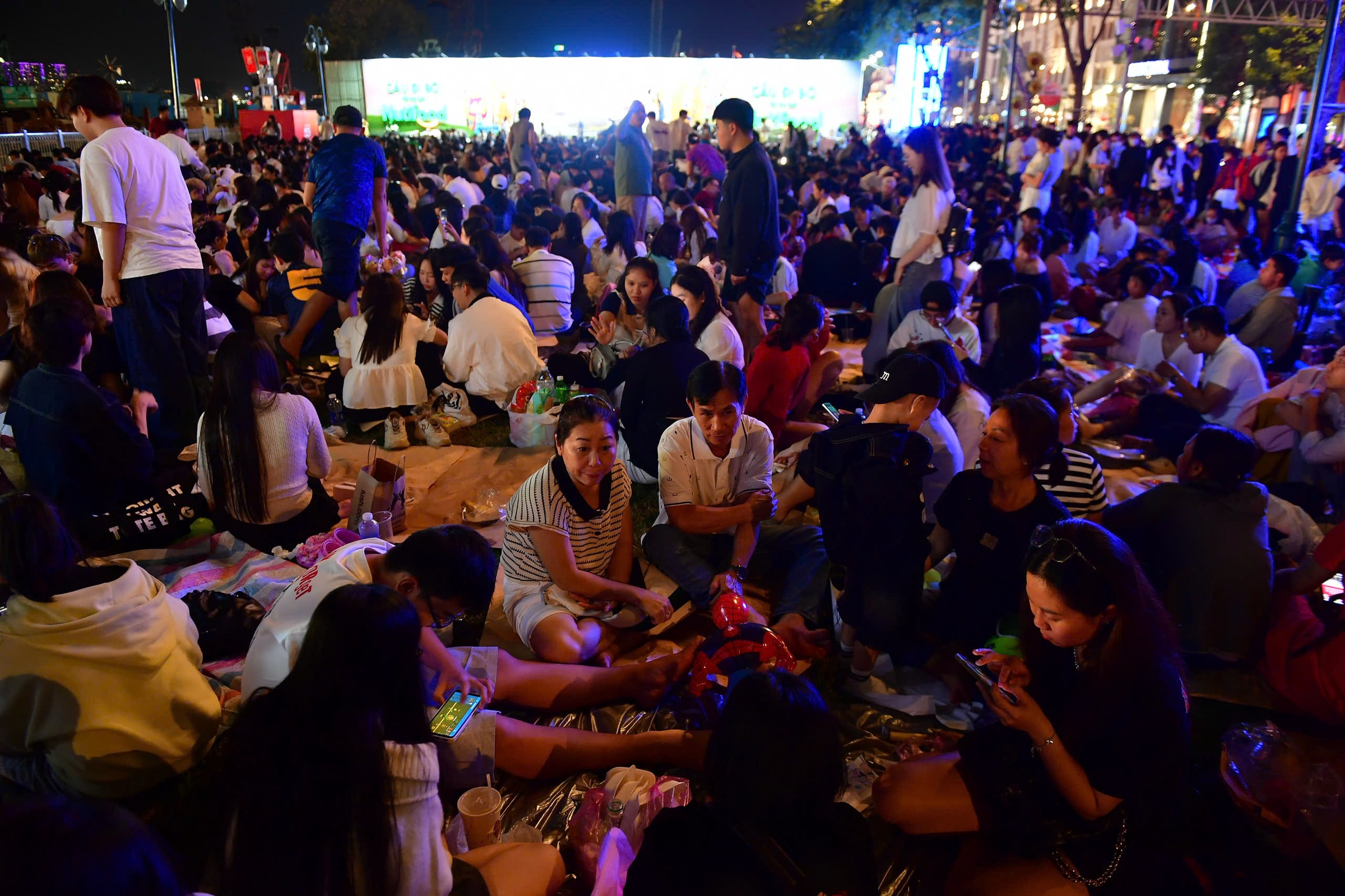 Người dân trải bạt ăn uống, nghỉ ngơi chờ xem pháo hoa tại bến Bạch Đằng.