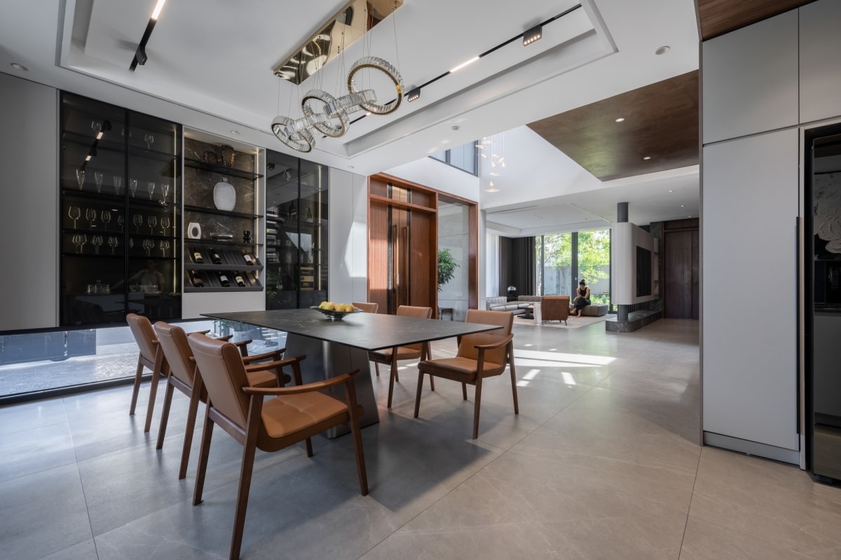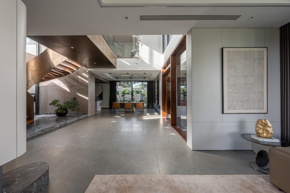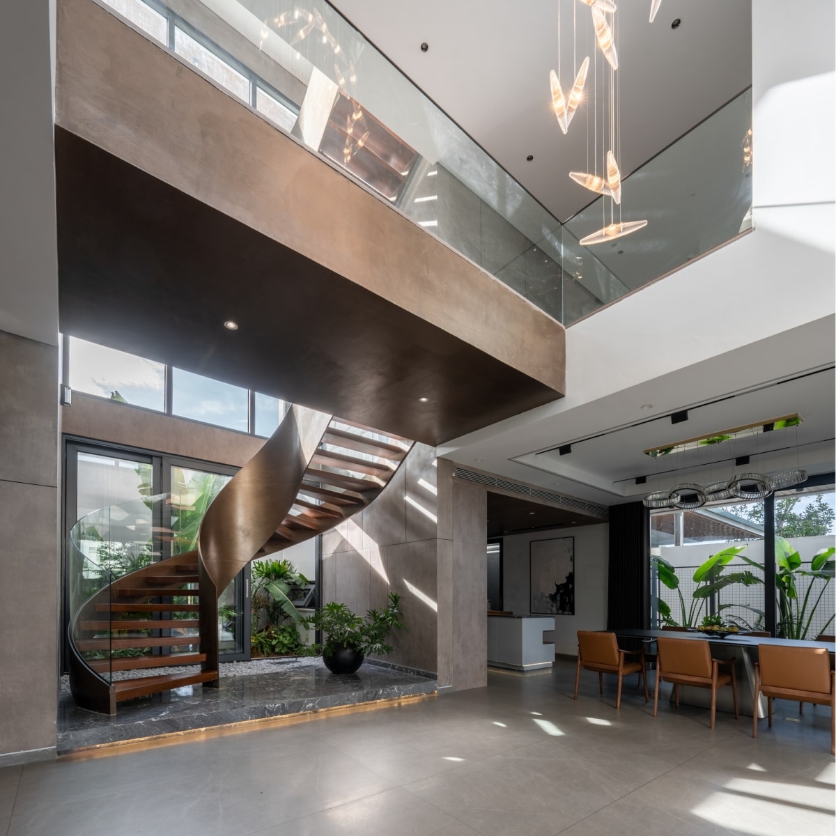 Công trình kết hợp phong cách hiện đại với hệ cây xanh và giếng trời lớn, tối ưu ánh sáng, kết nối các thành viên trong gia đình.