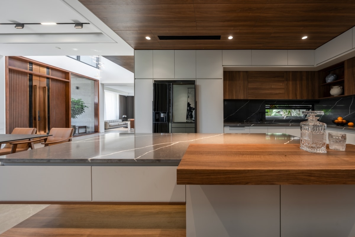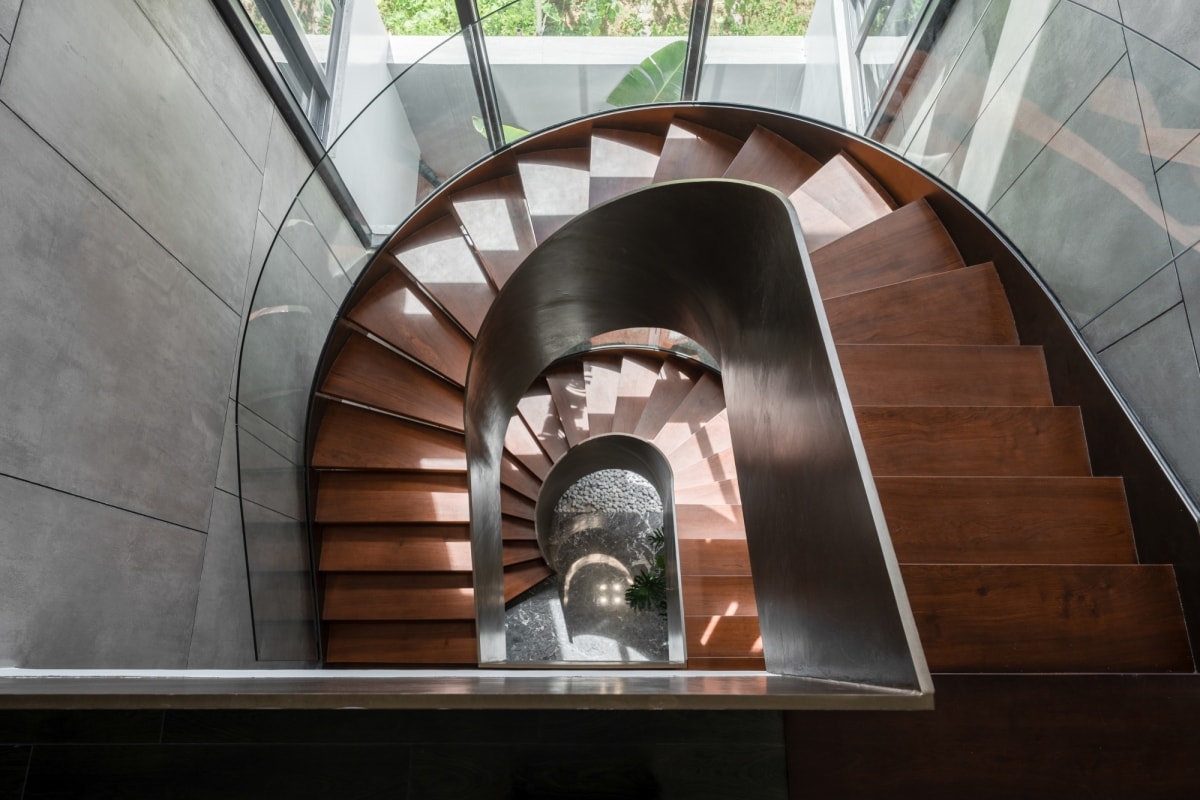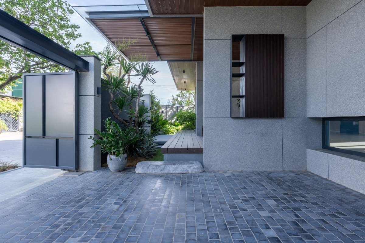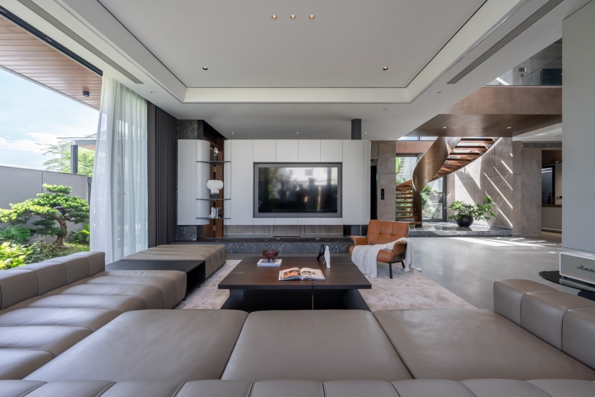 Công trình kết hợp phong cách hiện đại với hệ cây xanh và giếng trời lớn, tối ưu ánh sáng, kết nối các thành viên trong gia đình.