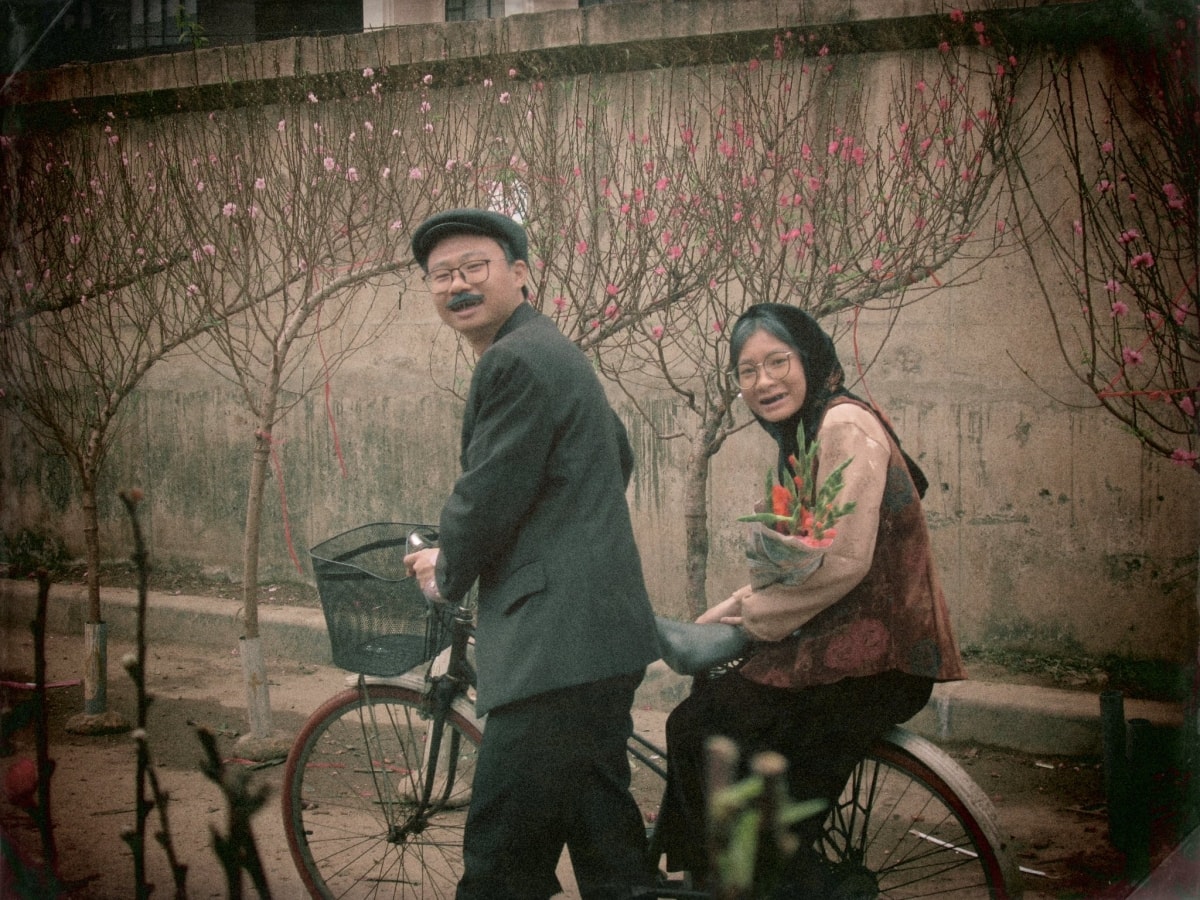 Hai bạn trẻ tái hiện ''tình yêu thời ông bà anh'', phía sau là những cành đào nở rộ, làm nổi bật không khí mùa xuân.