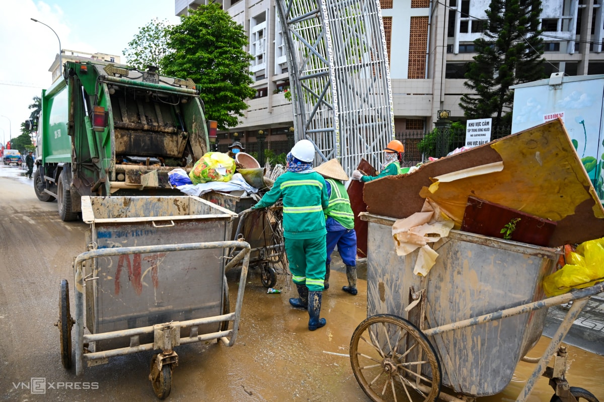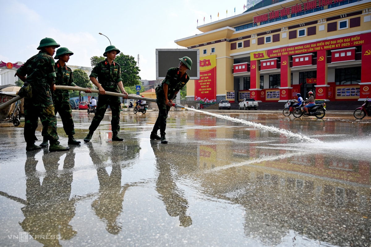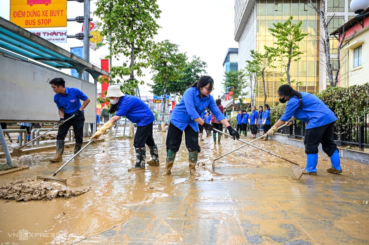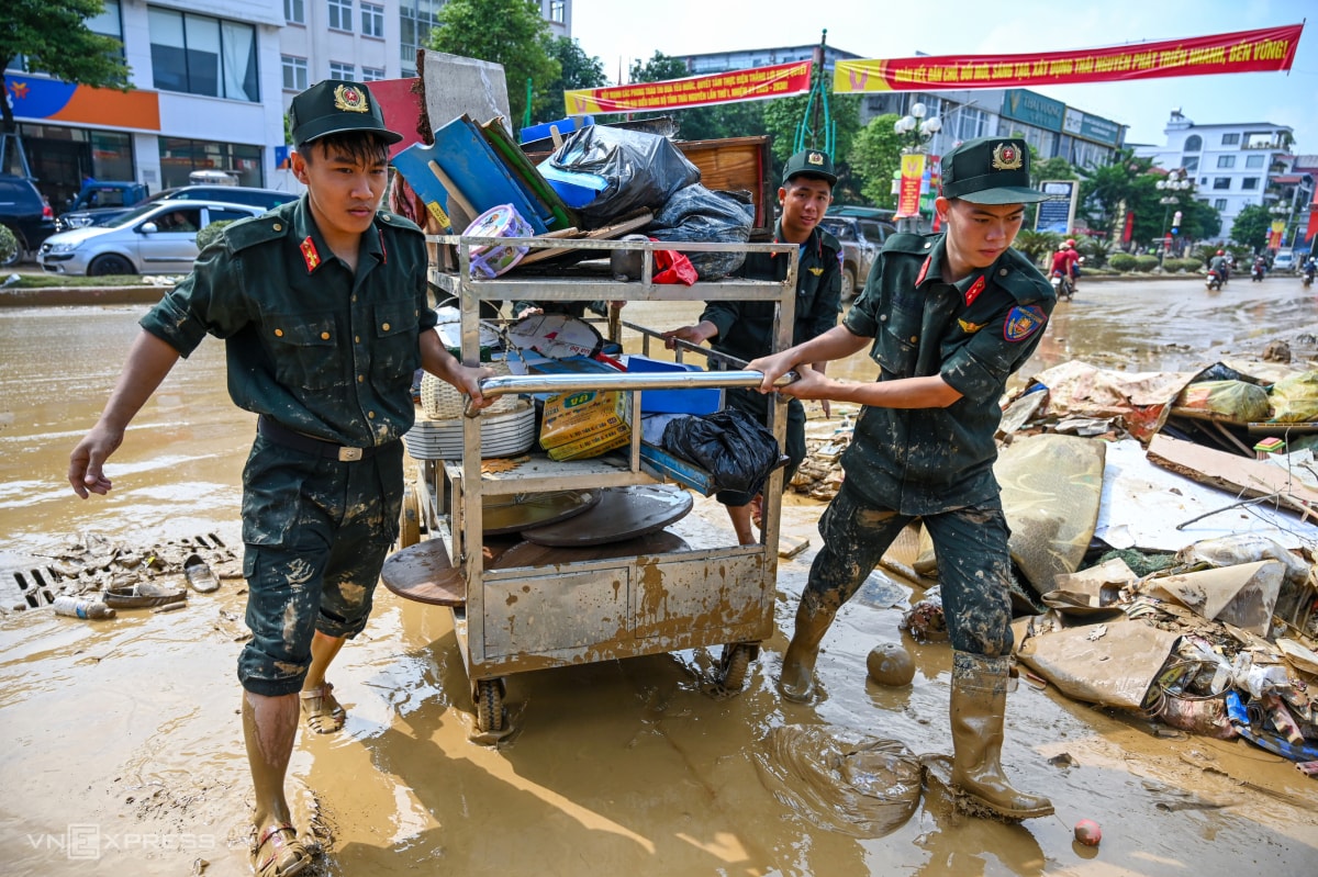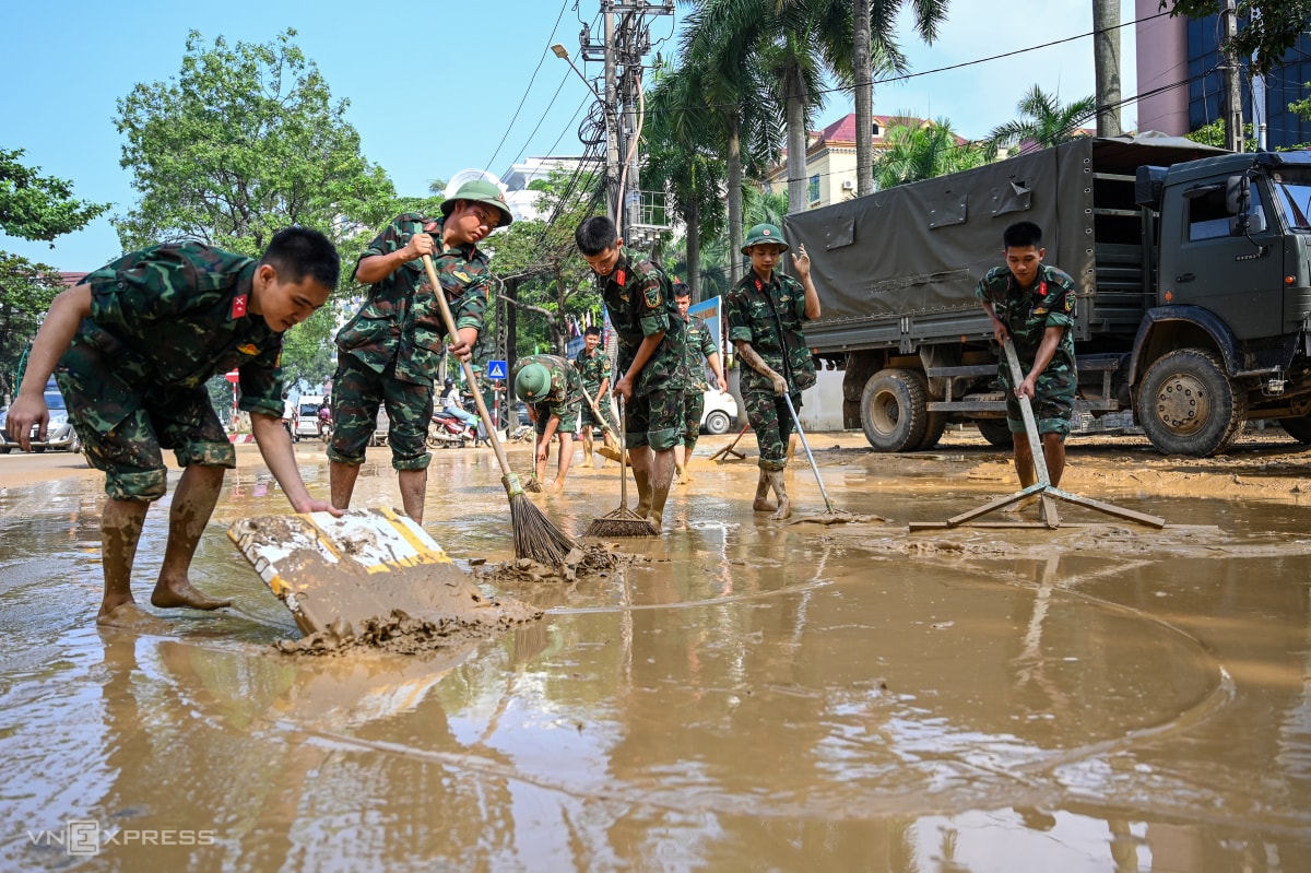 Hàng trăm bộ đội, công an, đoàn thanh niên cùng dọn dẹp các tuyến đường ở trung tâm tỉnh Thái Nguyên sau trận lụt lịch sử.