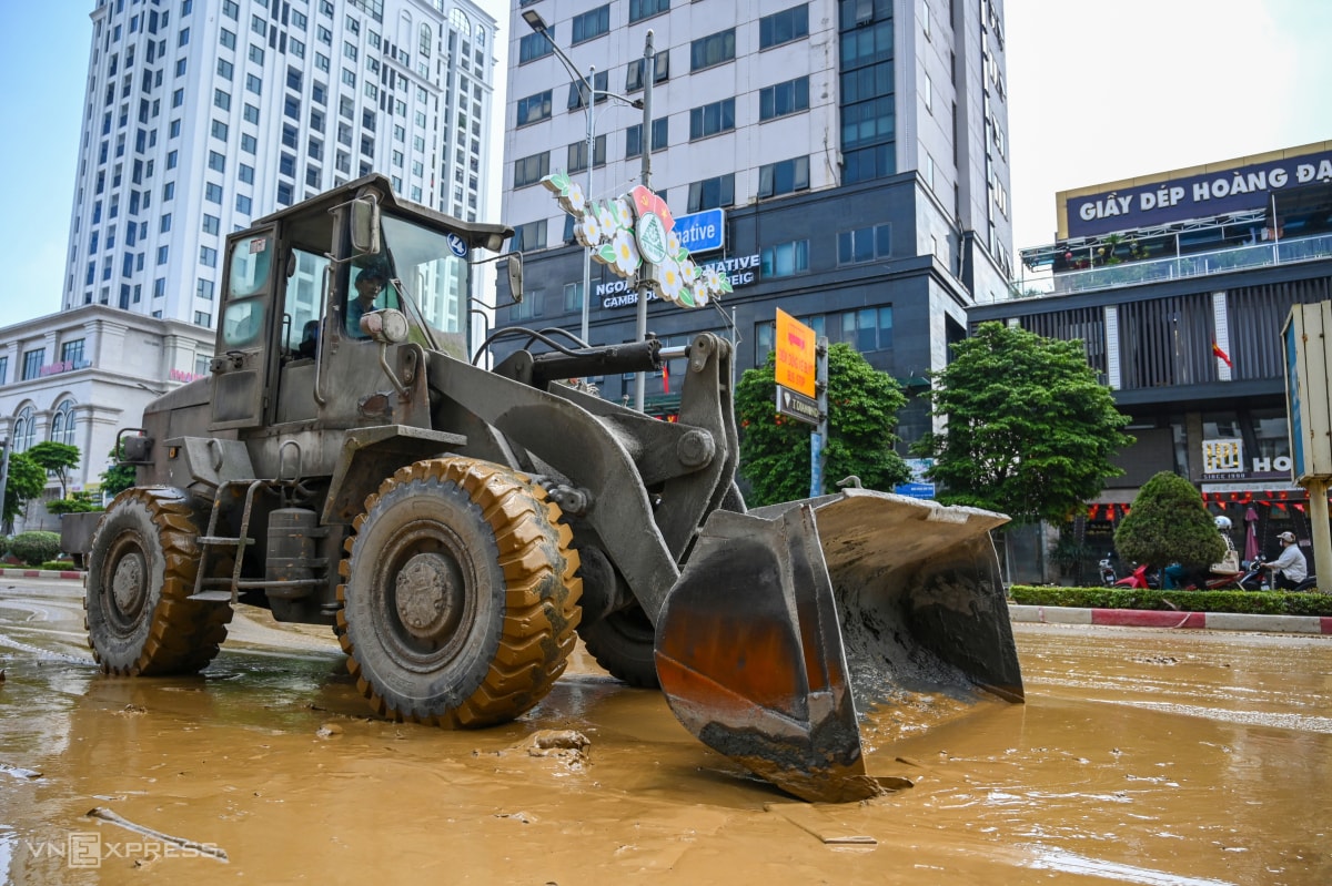Anh Duy Khoa, công nhân lái máy xúc, được công ty điều động ra đường Hoàng Văn Thụ để san gạt, thu dọn lớp bùn dày còn sót lại sau khi nước rút.