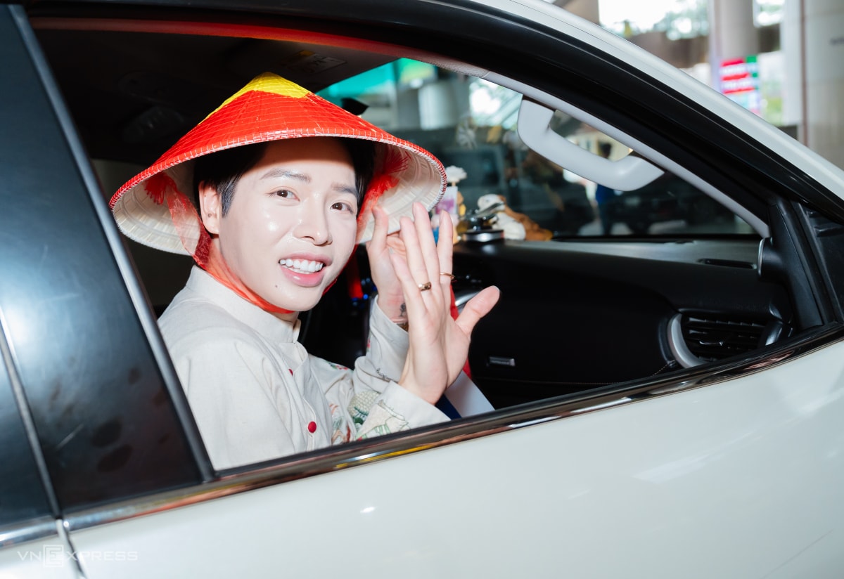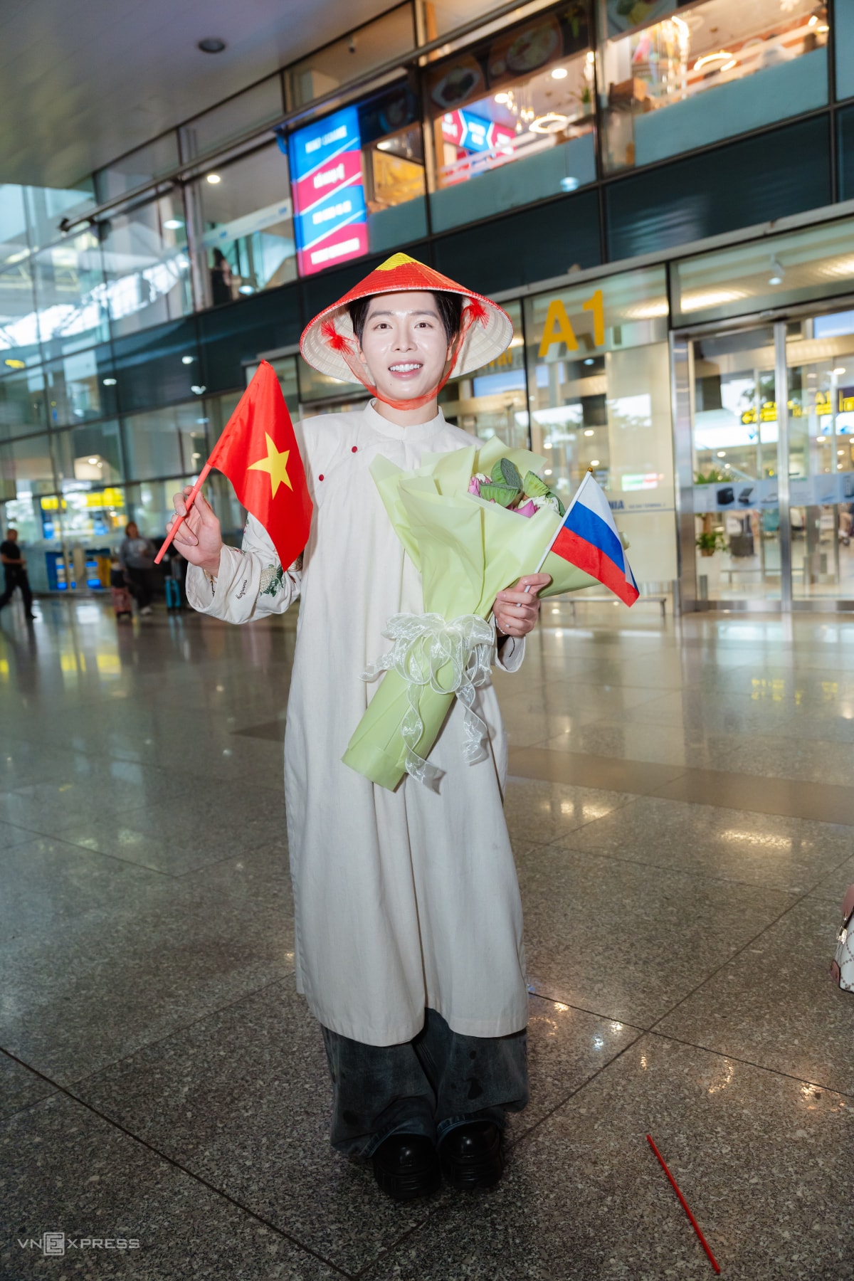 Đức Phúc mặc áo dài, đội nón lá khi trở về. Anh cho biết êkíp ở Nga chăm sóc, giúp đỡ anh chu đáo trong mọi khâu.