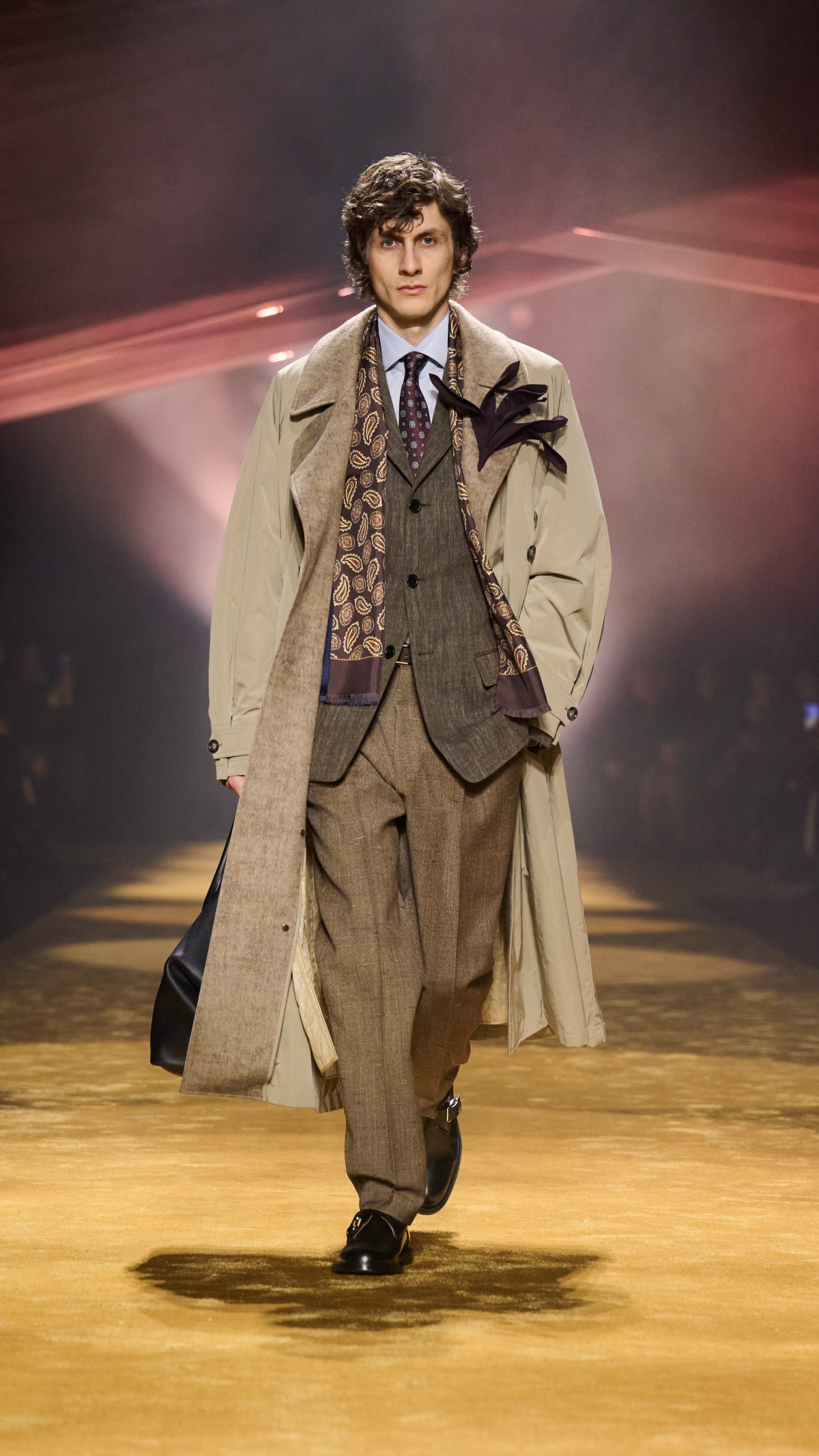 Đặc biệt, vân da đà điểu trên áo khoác dáng dài hay túi xách mang lại chiều sâu thị giác. Những điểm gồ ghề tự nhiên của da đà điểu tương phản với thớ vải len thượng hạng trơn mềm.