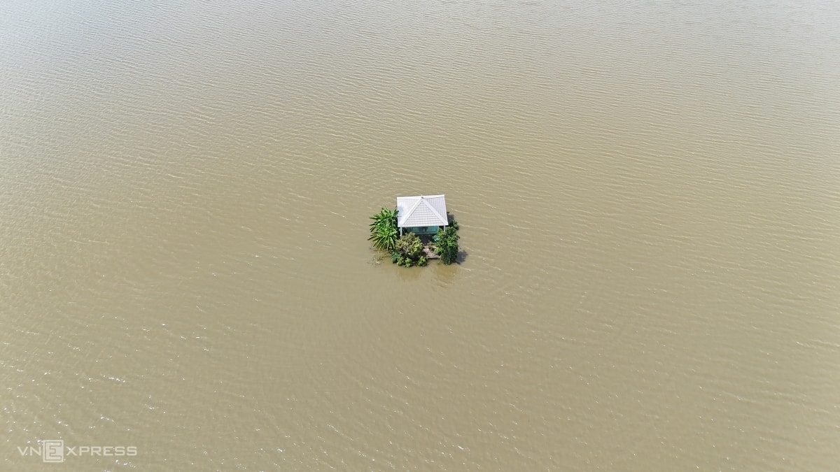 Căn nhà mồ bị ngập nền, nằm chơ vơ giữa cánh đồng ngập nước hơn 2 m.
