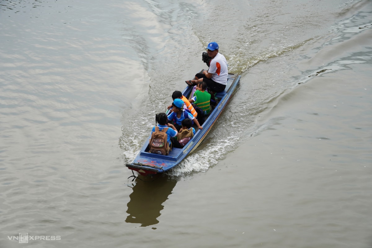 “Mỗi ngày tôi chạy xuồng bốn lượt đưa rước con, chẳng còn thời gian làm việc khác”, anh Thiện nói.