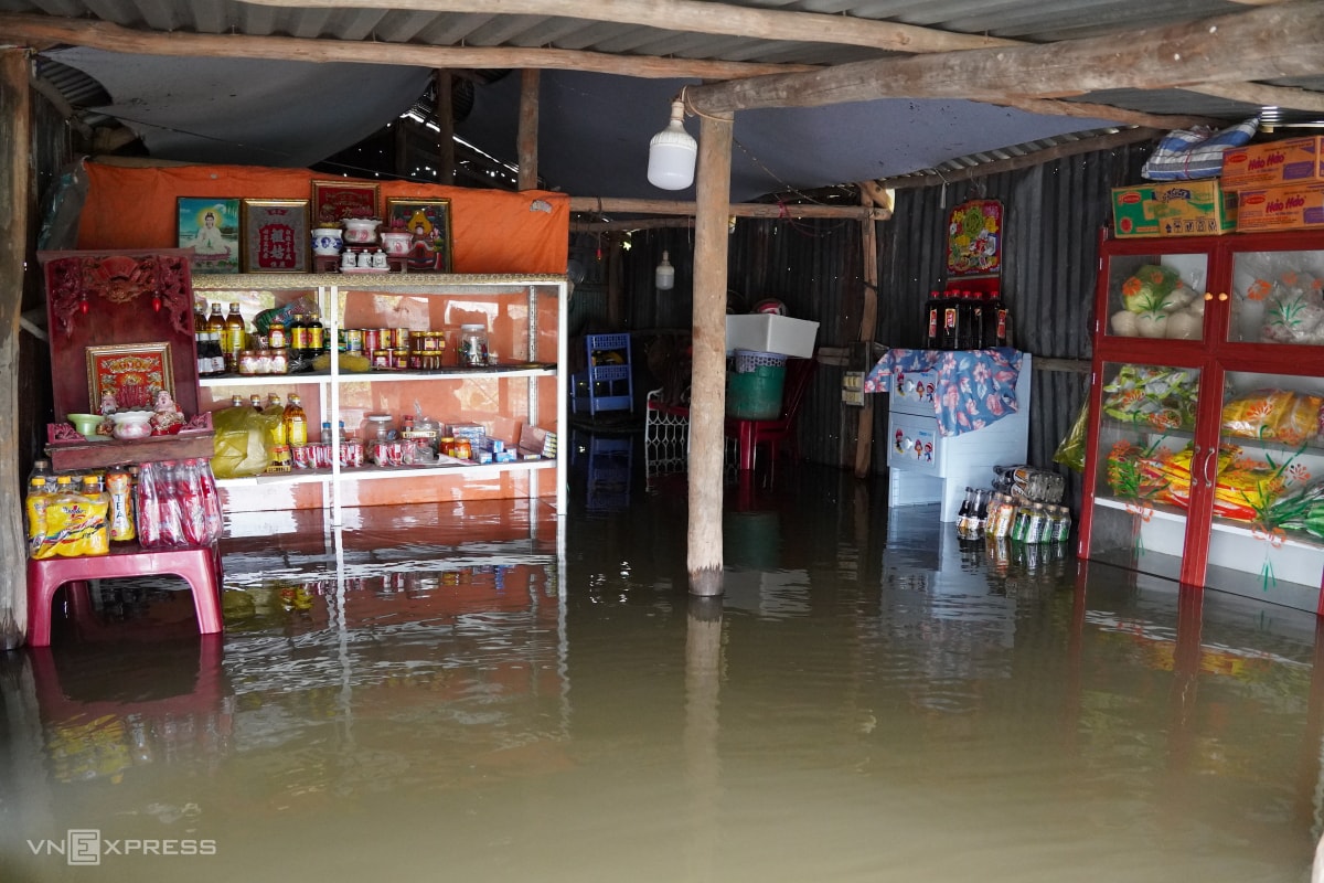 Kế bên nhà, tiệm tạp hóa của gia đình do nền thấp cũng bị ngập sâu gần một mét.