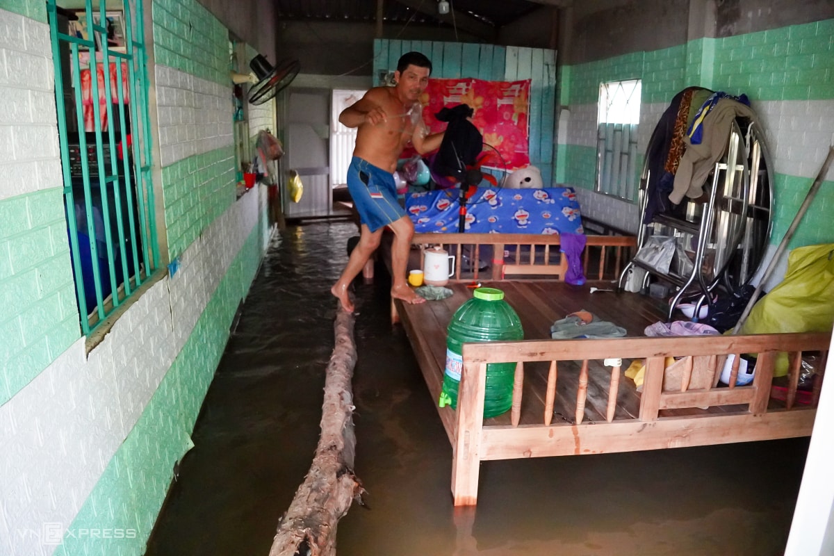 Cạnh nhà bà Ba, hai tuần nay gia đình ông Nguyễn Văn Đông, 52 tuổi, phải bì bõm trong căn nhà bị ngập nước 30-50 cm. Chủ nhà phải dùng cây tràm làm cầu tạm để đi lại cho khỏi ướt chân.