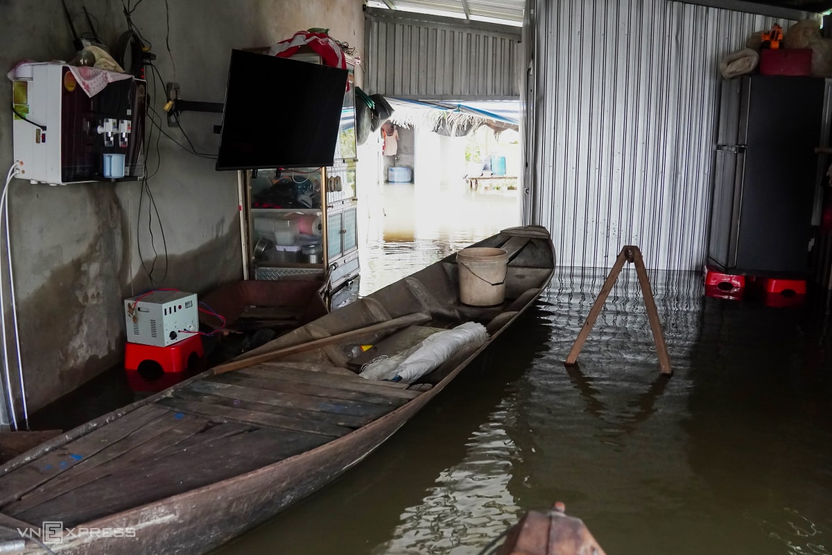 Người dân vùng Đồng Tháp Mười dùng xuồng di chuyển trong nhà, kê cao đồ đạc khỏi ngập ở đợt lũ cao nhất trong 10 năm trở lại.