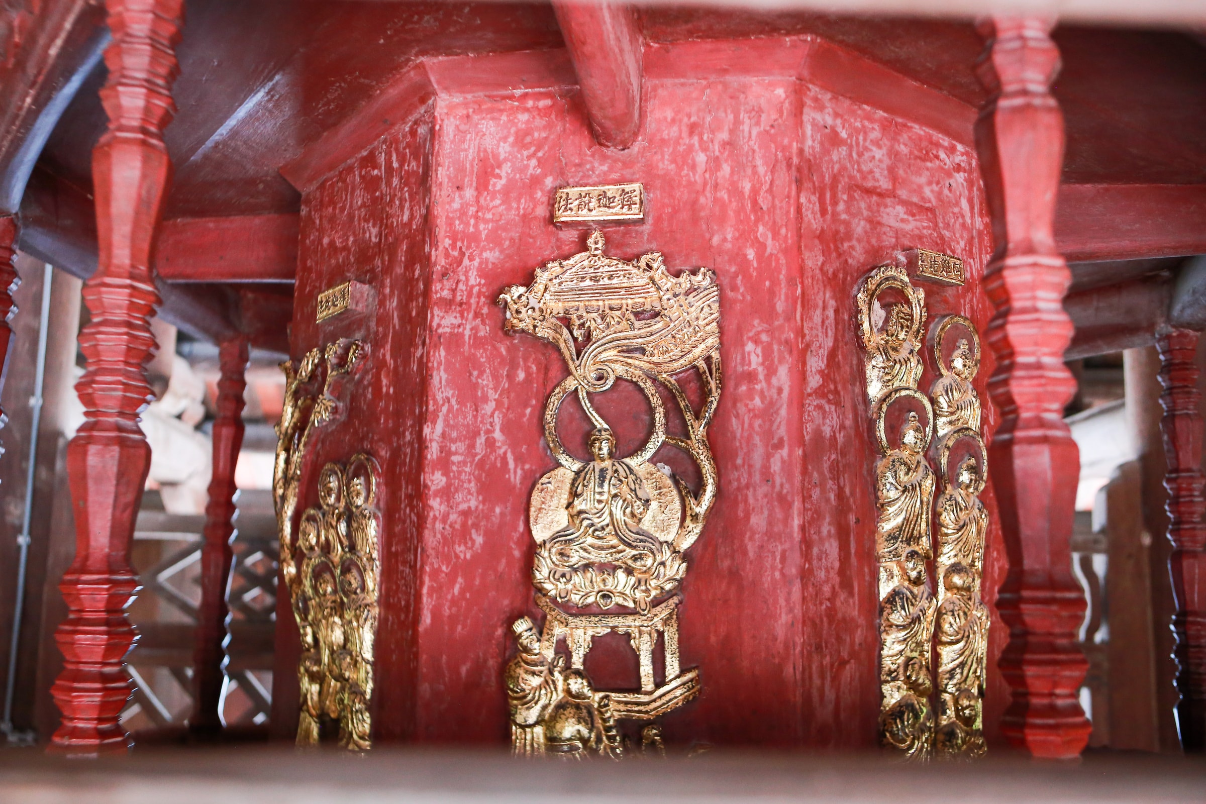 Cửu phẩm liên hoa hình bát giác, cao 7,8 m, xếp 9 tầng, 8 mặt theo kiểu tòa sen, thể hiện 9 kiếp tu của đức Thích Ca Mâu Ni. Chín tầng cối kinh tạc hàng trăm tượng phật, hoa lá, chim muông, tập trung chủ đề khuyến thiện trừ ác, giới thiệu hành trang các vị tổ thiền tông, các đại sư, các cấp độ thăng hoa trên đường lên cõi niết bàn.
