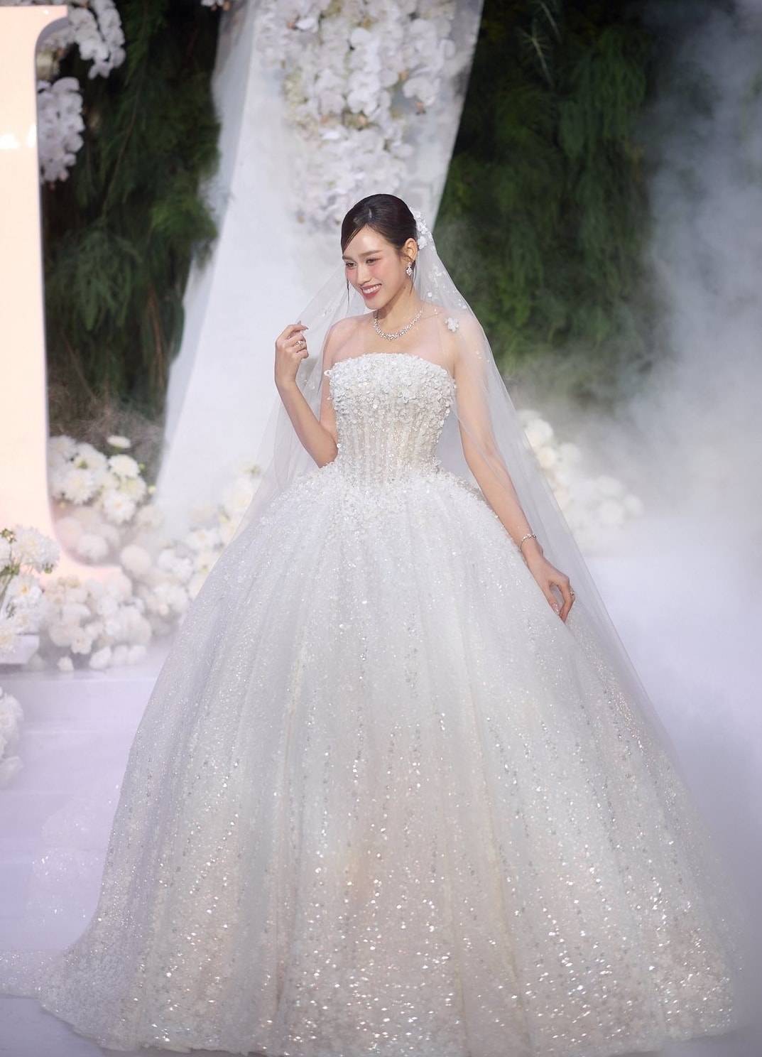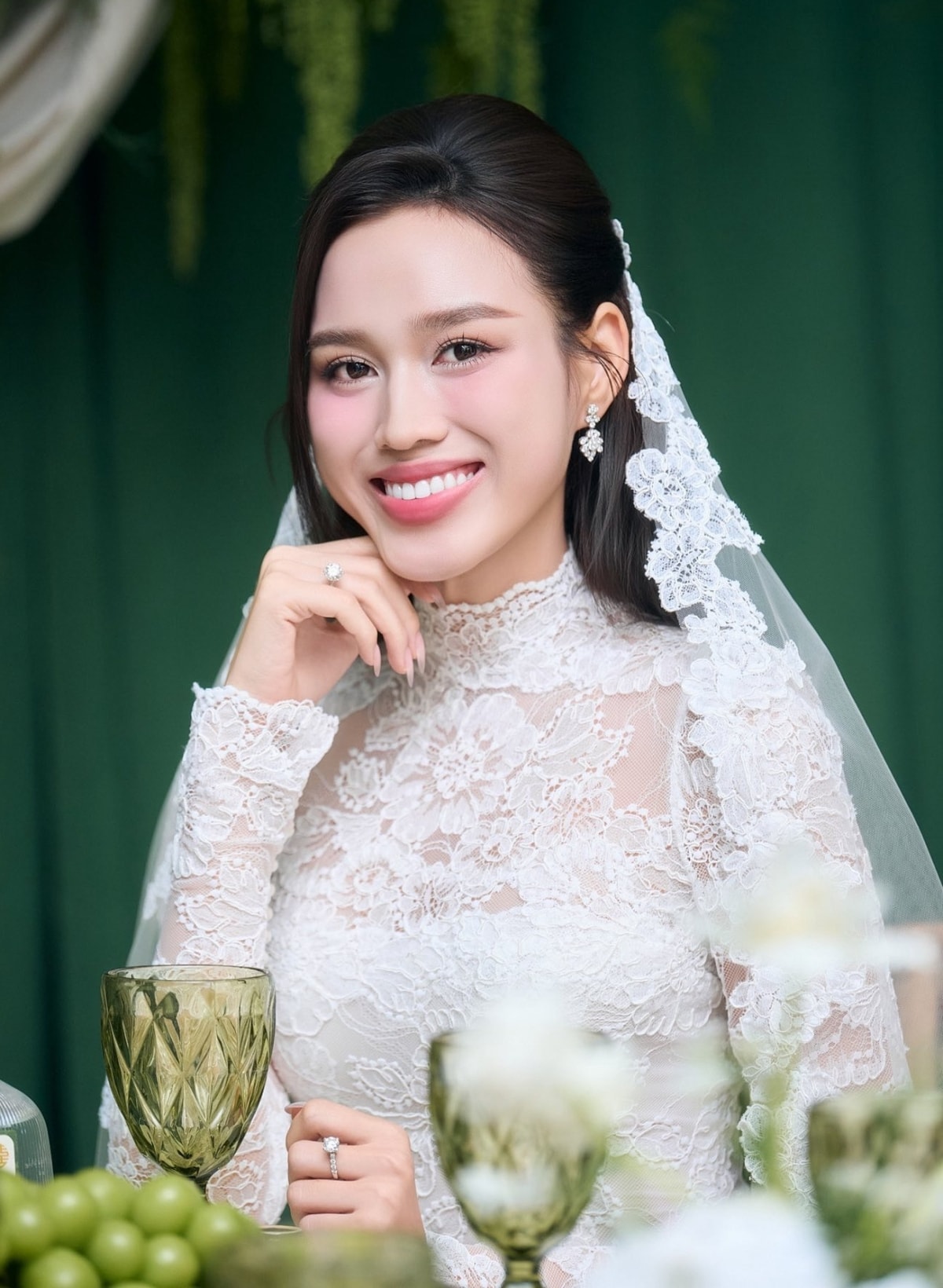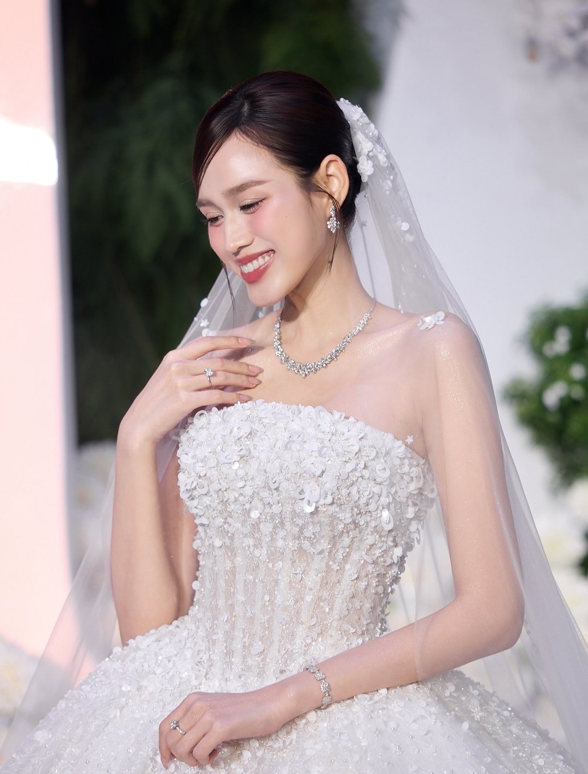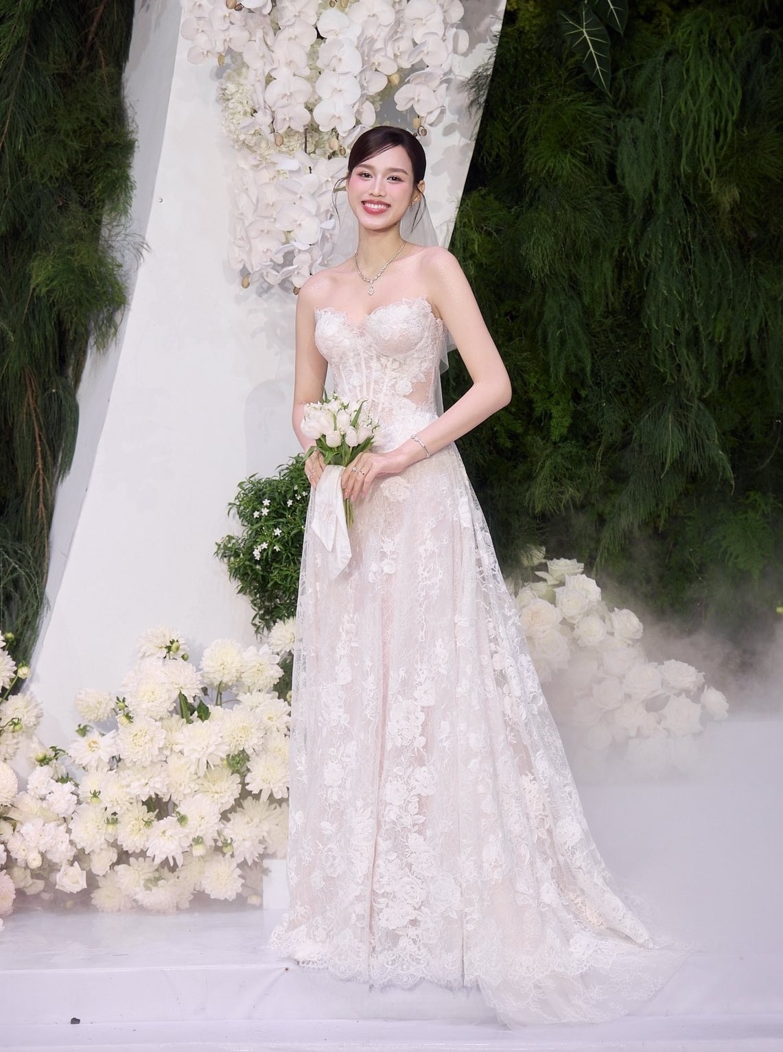 Hoa hậu Đỗ Thị Hà diện ba bộ đầm cưới quây ngực và áo dài ren hoa trong ngày cưới ở Quảng Trị và Thanh Hóa.