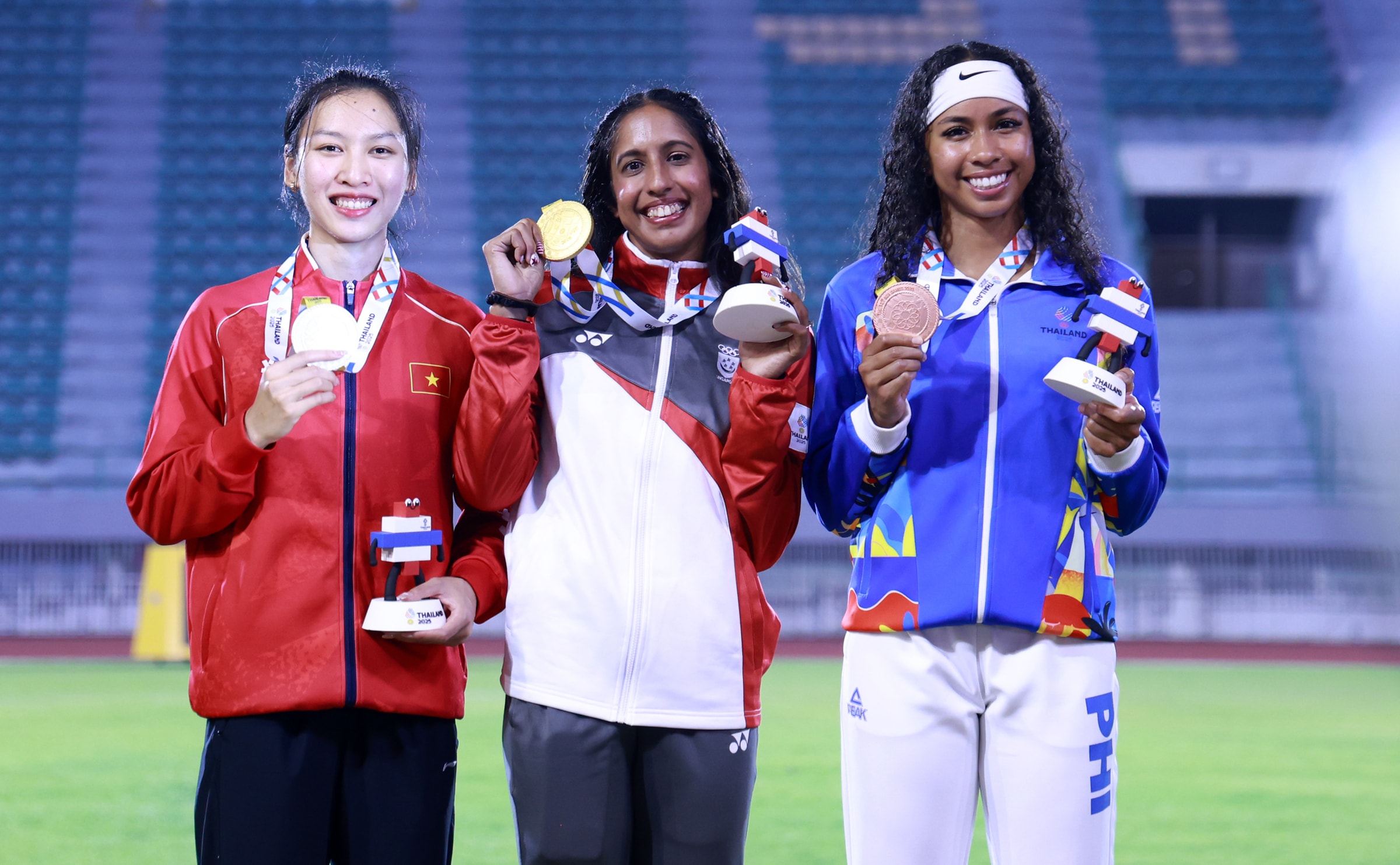 Chân chạy 20 tuổi Lê Thị Cẩm Tú đoạt HC bạc nội dung 200m nữ với thành tích 23 giây 14, đồng thời phá KLQG tồn tại 15 năm.