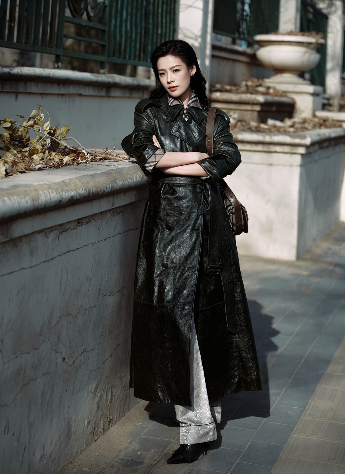 Người đẹp phối áo da và quần ngủ dạo phố.