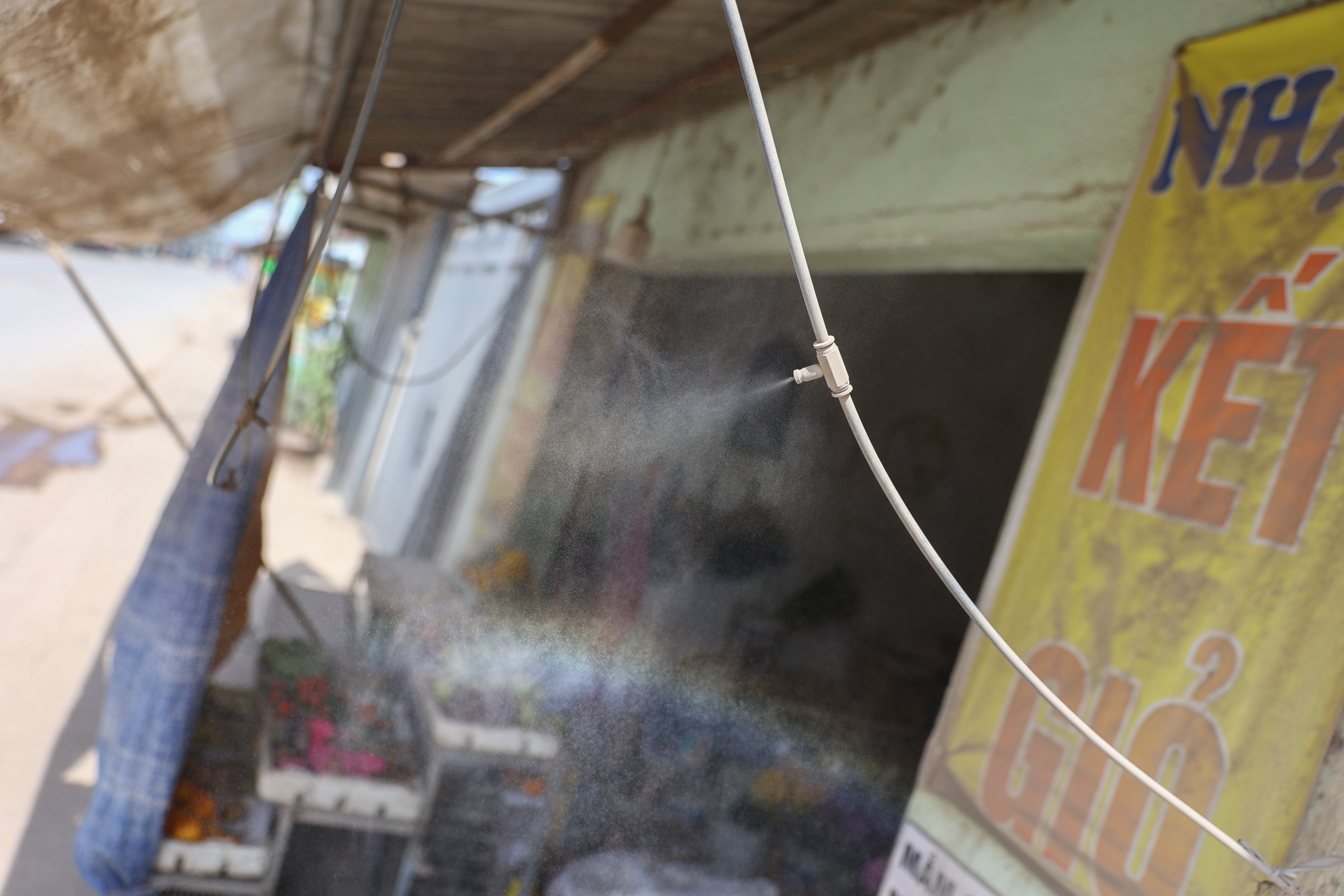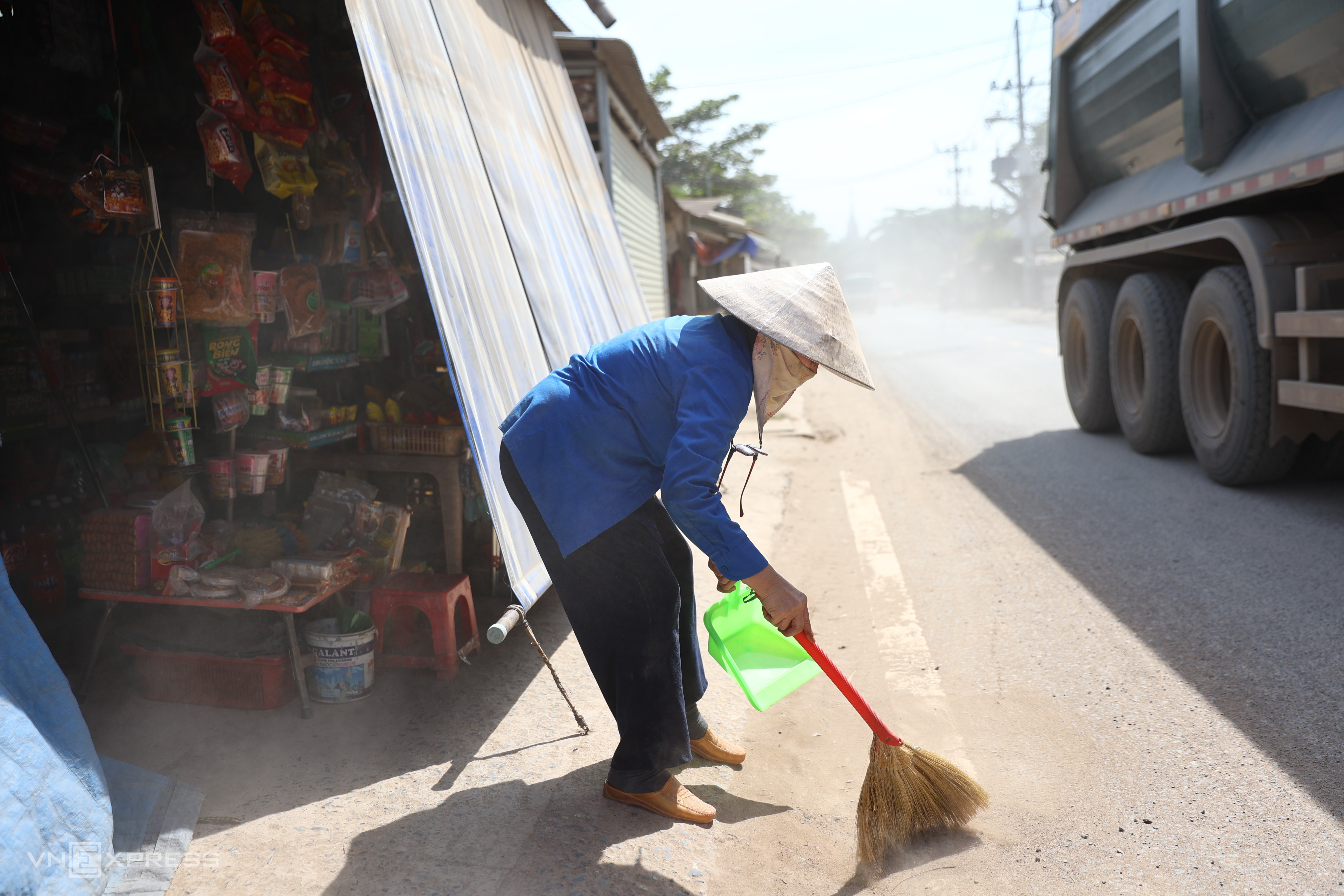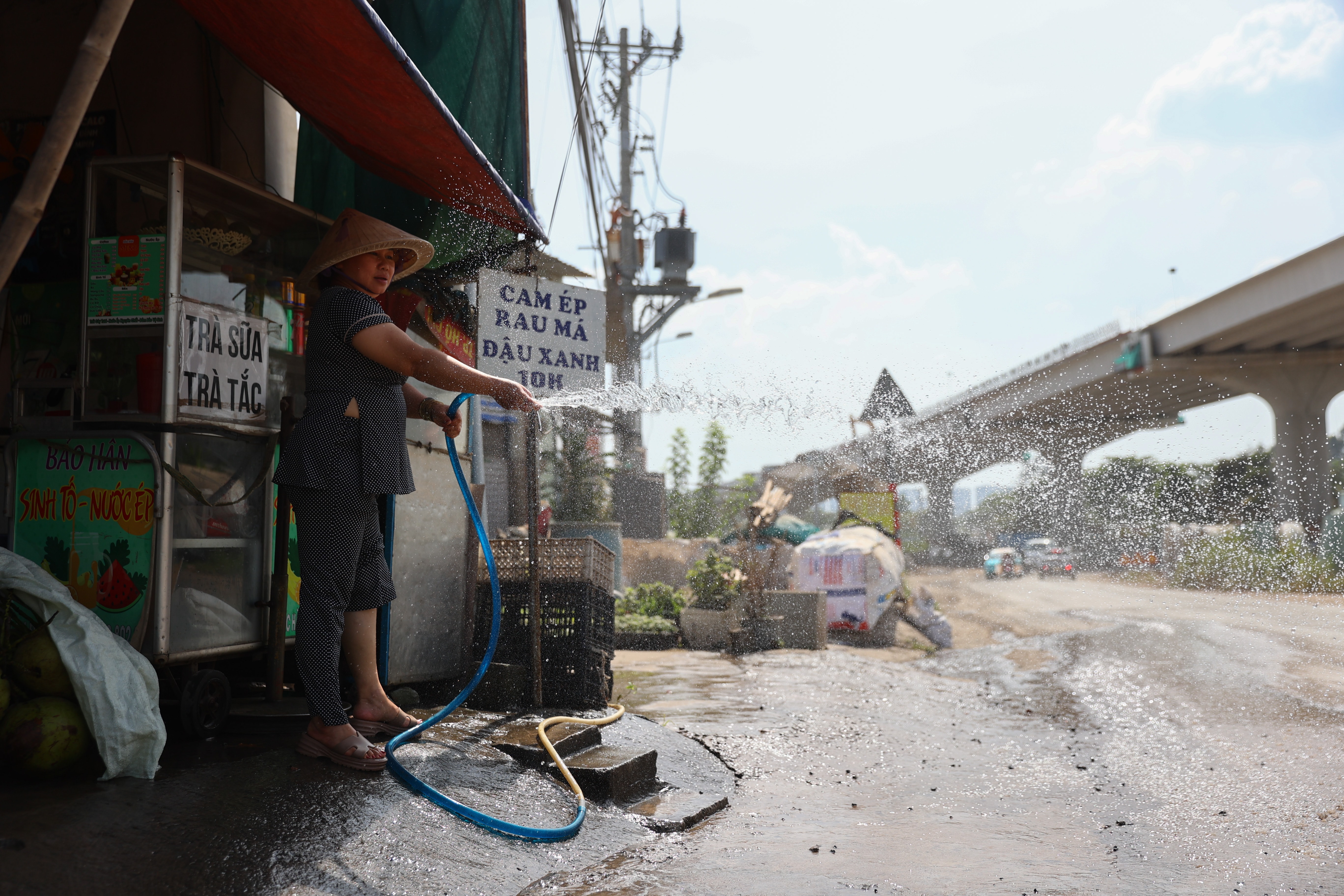 Thi công Vành đai 3 khiến đường Nguyễn Xiển bụi mù mịt, người dân tìm mọi cách che chắn, tưới nước, lau nhà để hạn chế.