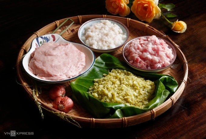 Chuẩn bị các nguyên liệu khác: Để tạo độ kết dính cho chả cốm nên dùng giò sống. Phần thịt nạc vai mềm băm nhỏ tạo vị mềm ngọt tự nhiên không bị khô. Mỡ phần luộc sơ, băm nhỏ. Hành khô bóc vỏ, băm nhỏ. Các gia vị nêm nếm quen thuộc gồm có nước mắm truyền thống, hạt tiêu, mì chính và chút đường.