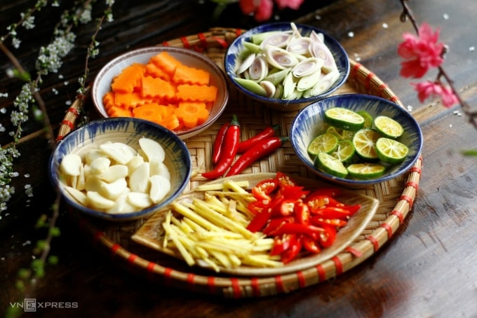 Sơ chế nguyên liệu khác: Cà rốt gọt vỏ, thái sợi mảnh. Tỏi bóc vỏ, thái lát. Sả thái lát. Ớt thái lát. Gừng rửa sạch, thái sợi nhỏ. Tắc cắt lát mỏng, bỏ hạt.