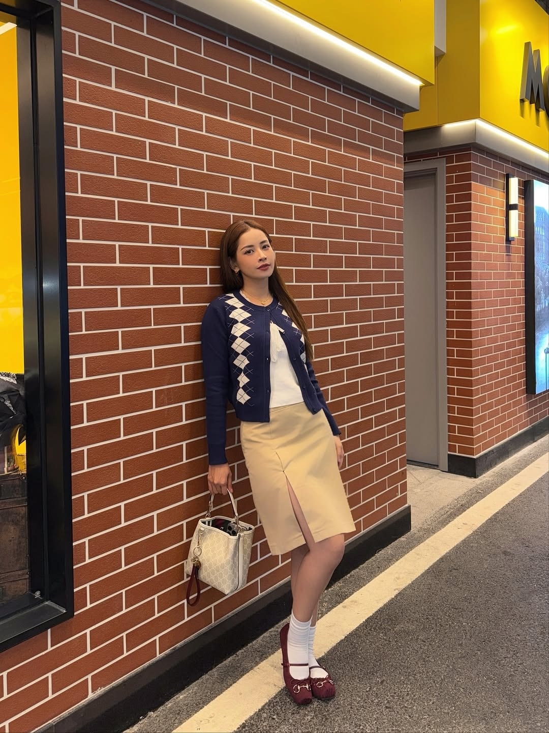 Trong chuyến du lịch Thẩm Quyến, Trung Quốc cùng bạn thân, Chi Pu chọn áo khoác len mỏng họa tiết quả trám phối chân váy xẻ đùi, giày búp bê. Ca sĩ sử dụng túi xô, kích thước nhỏ gọn nhưng vẫn đựng được nhiều đồ. Kiểu phối này phù hợp với những cô gái chuộng phong cách nữ tính.