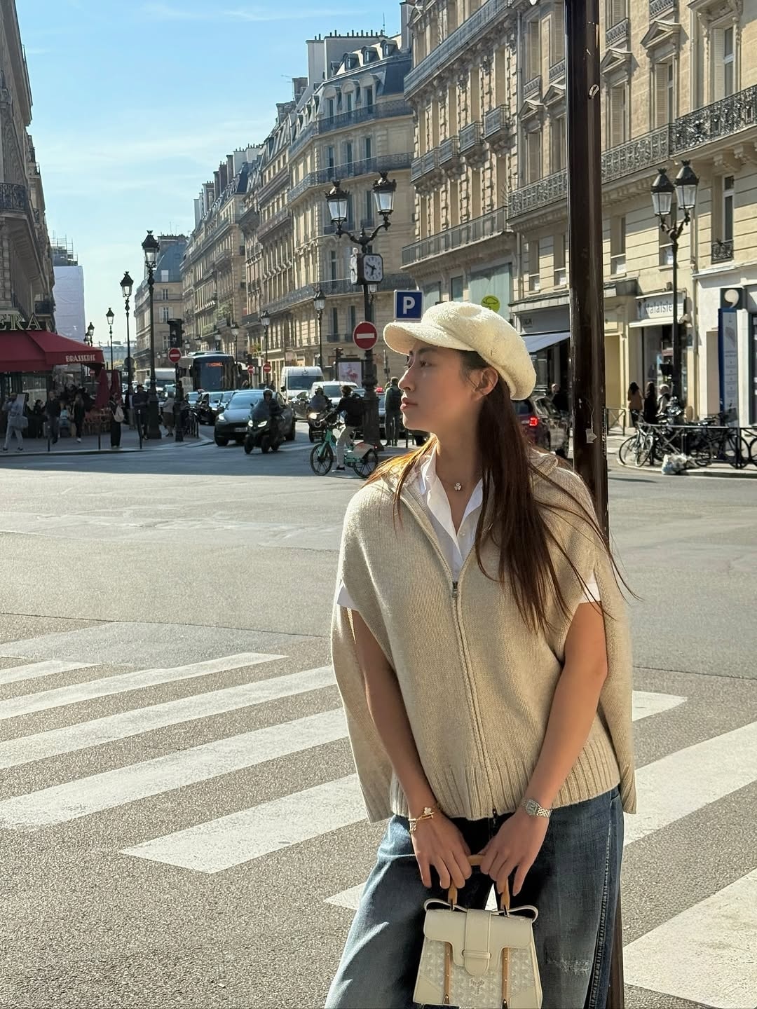 Hoa hậu Lương Thùy Linh tạo sự khác biệt bằng mẫu áo len dáng cape màu be, kết hợp sơ mi cộc tay, quần jeans dáng rộng và túi Goyard. Cô tạo điểm nhấn cổ điển bằng mũ beret vải tweed.