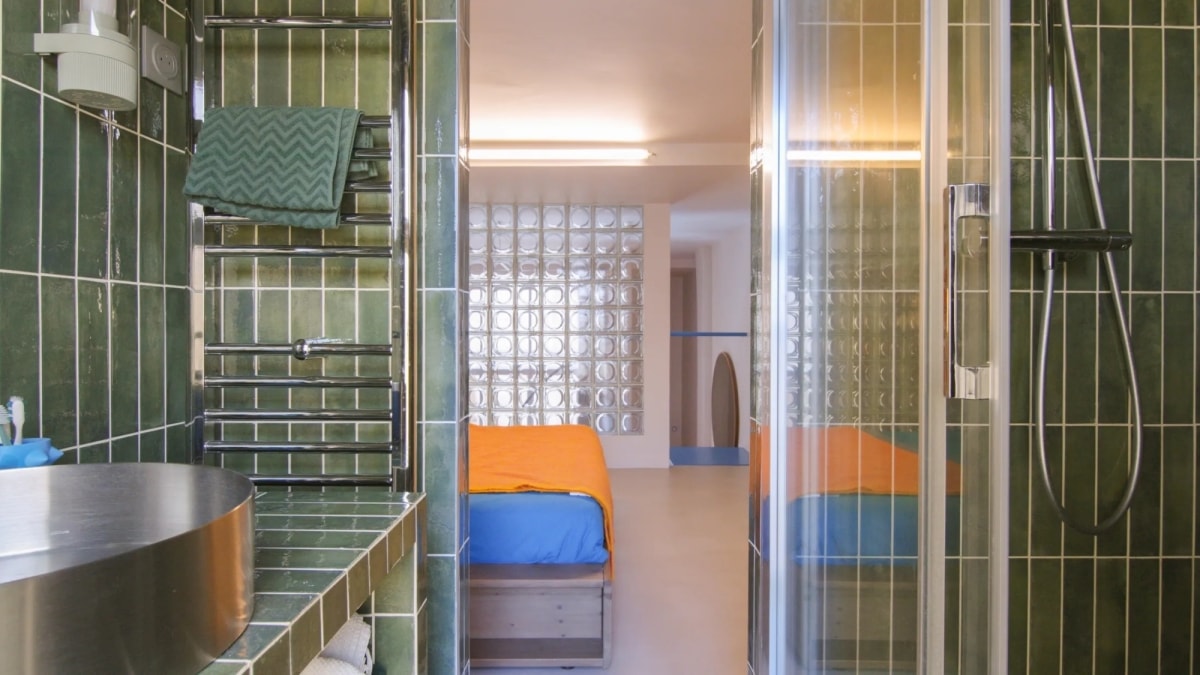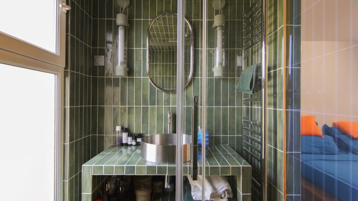 Thiết kế căn hộ khai thác bảng màu cam - xanh, kết hợp chi tiết hình khối để tăng trải nghiệm thị giác trong diện tích nhỏ.