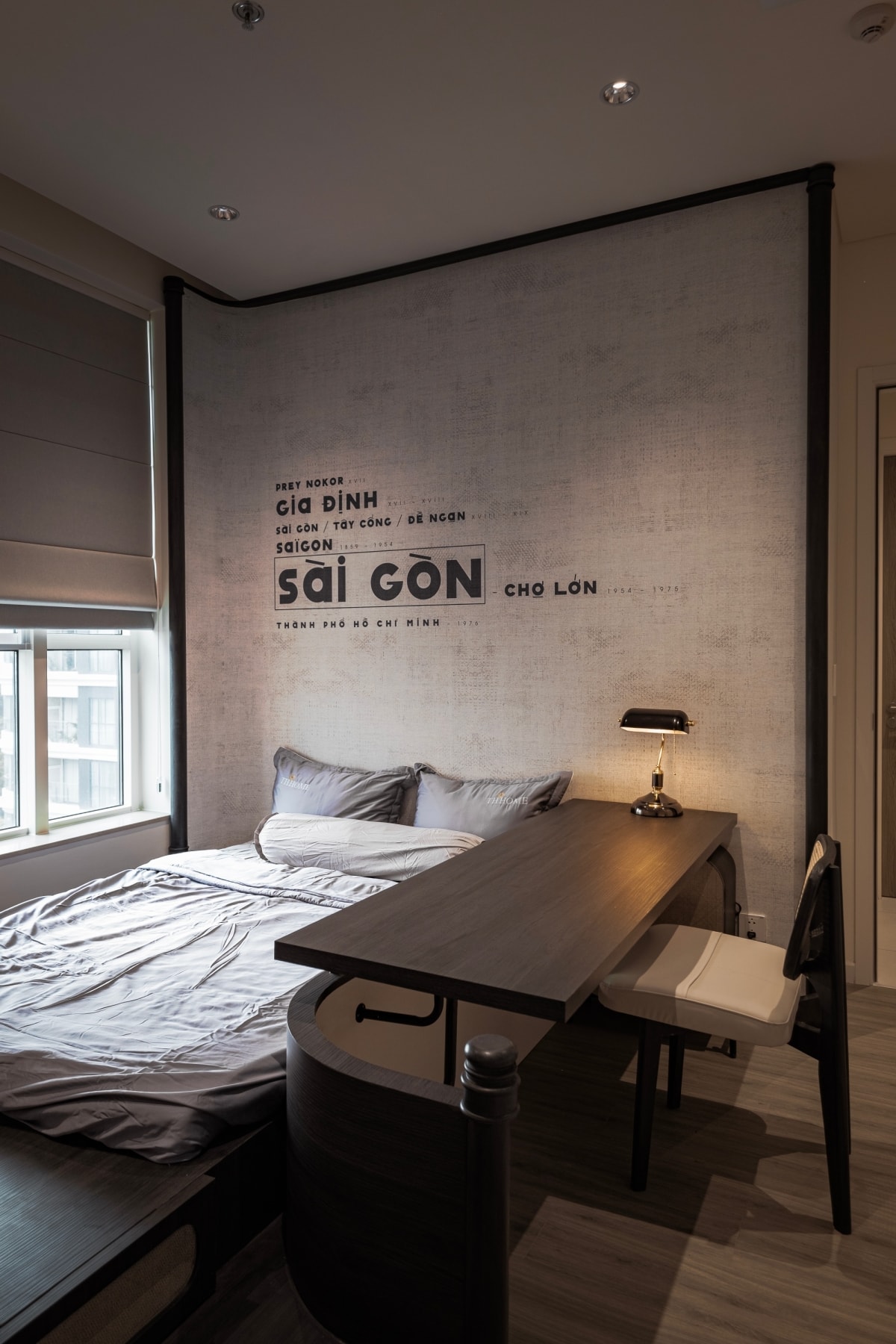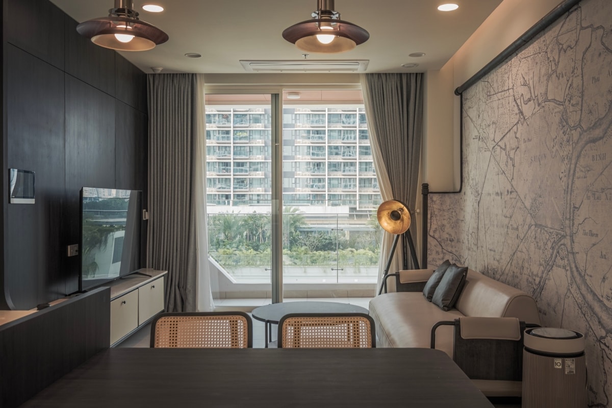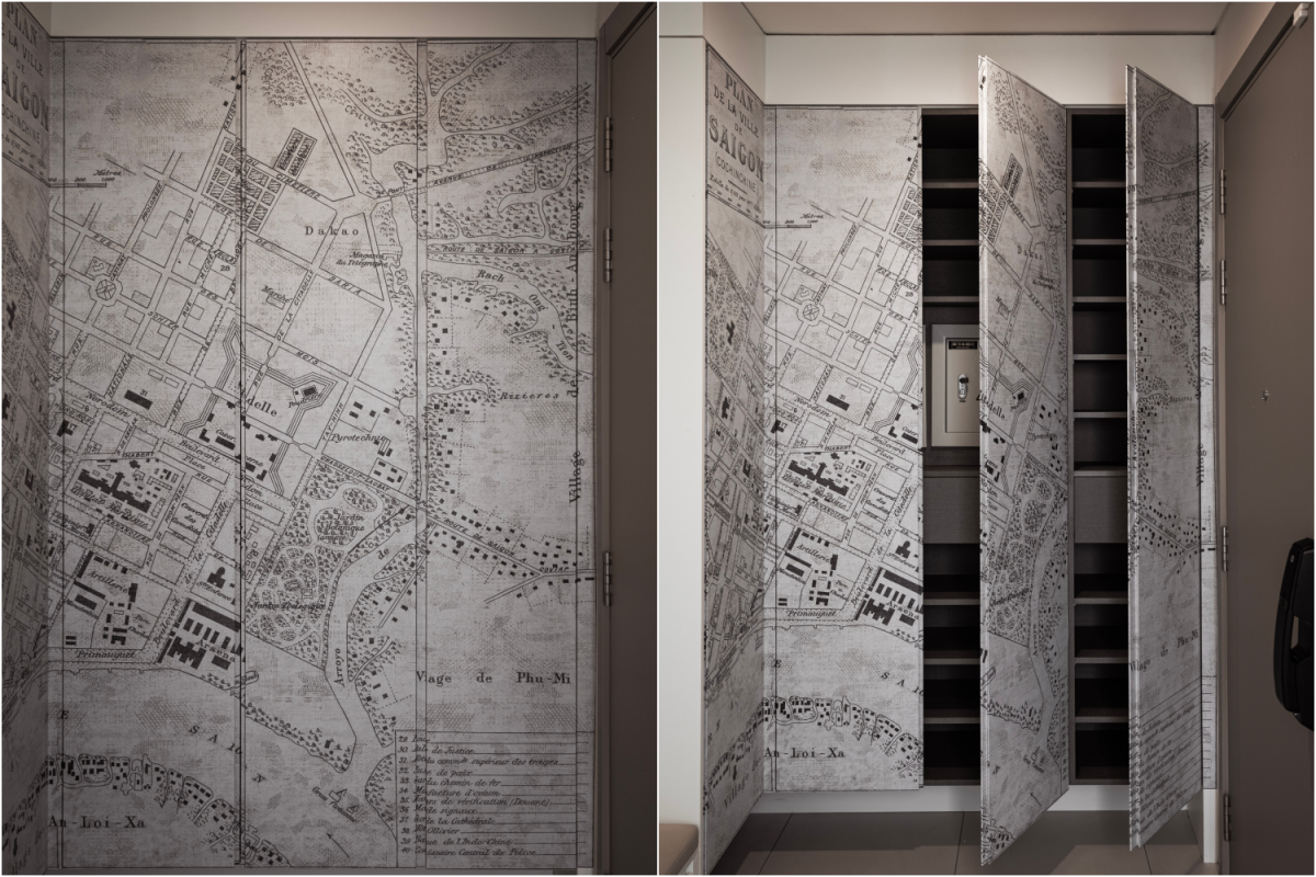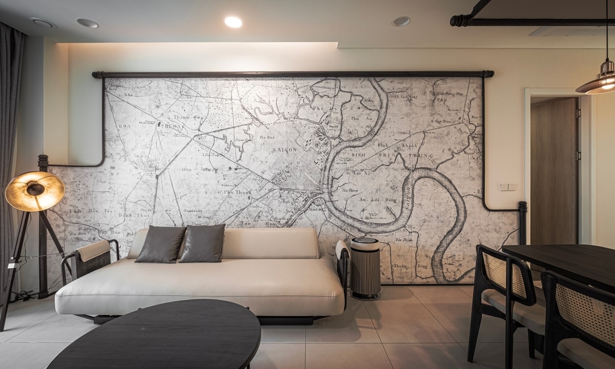 Những tấm bản đồ Sài Gòn xưa được đưa vào không gian như lớp nền thị giác xuyên suốt, kết nối các chi tiết nội thất mang phong cách Indochine đương đại trong căn hộ.