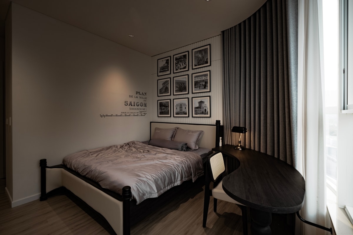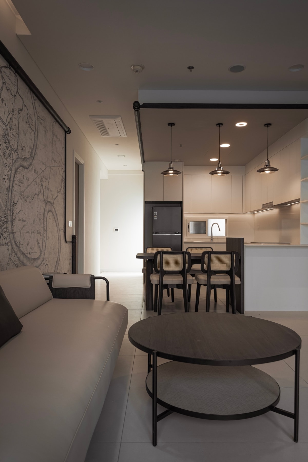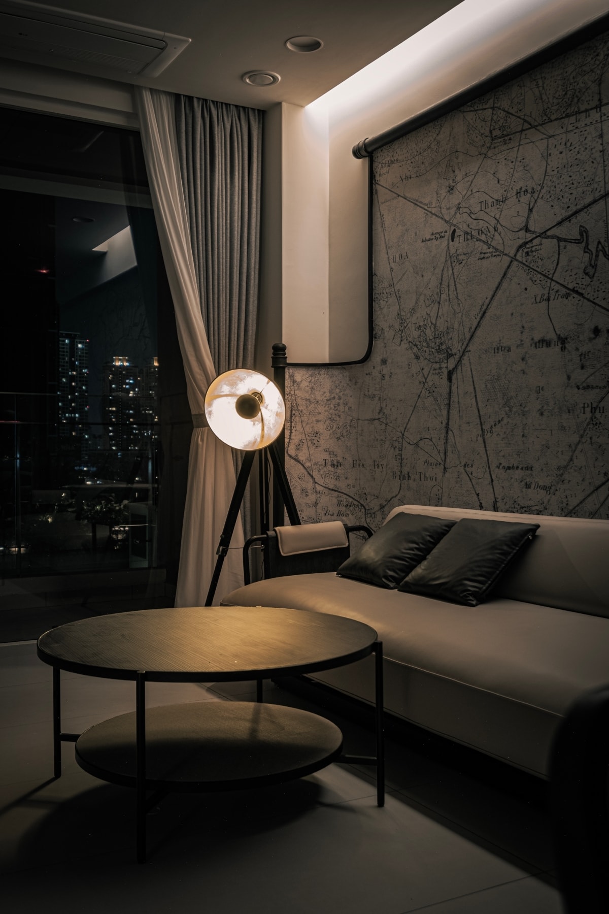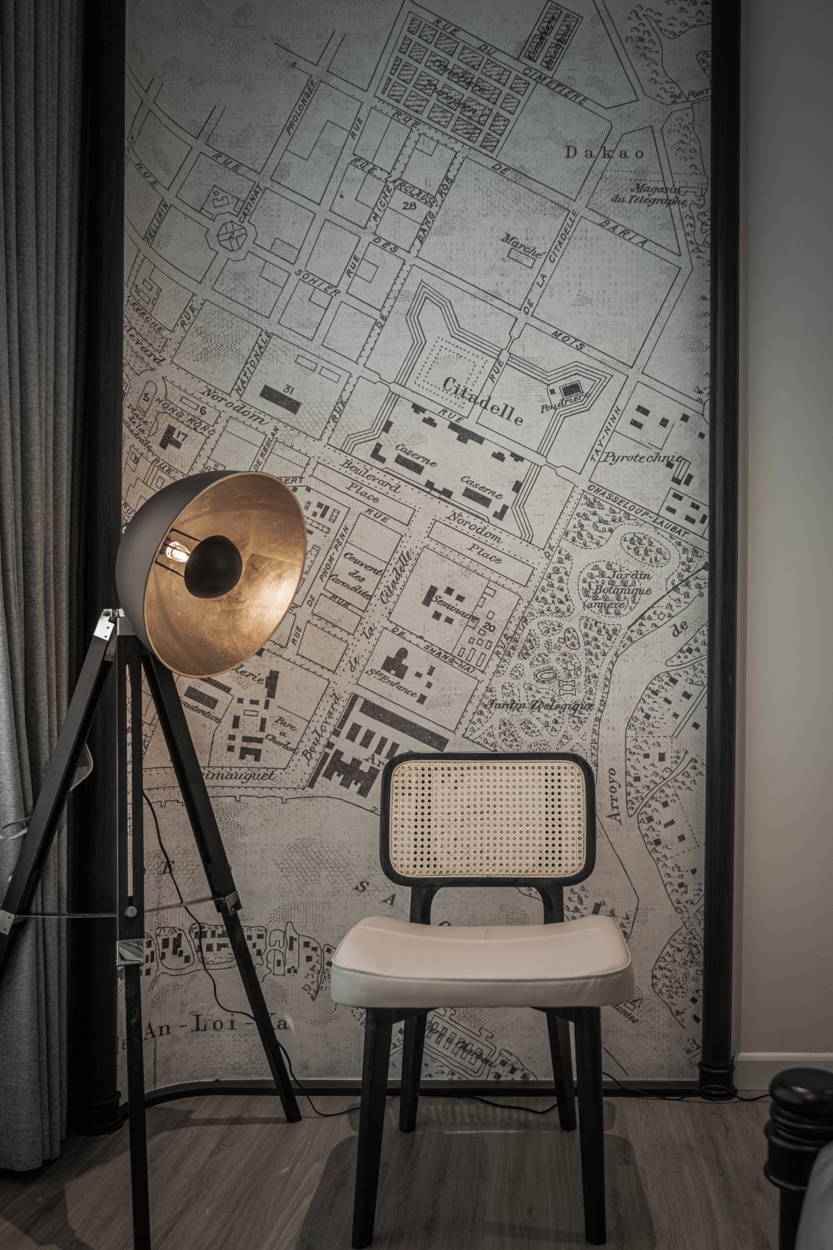 Những tấm bản đồ Sài Gòn xưa được đưa vào không gian như lớp nền thị giác xuyên suốt, kết nối các chi tiết nội thất mang phong cách Indochine đương đại trong căn hộ.