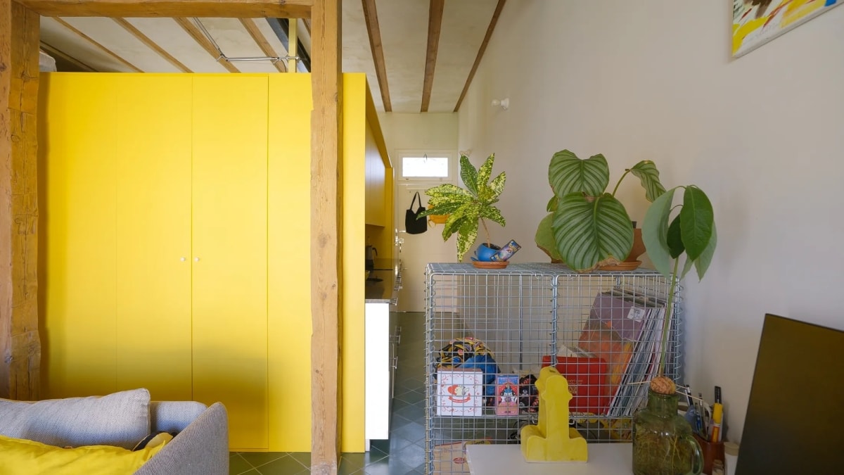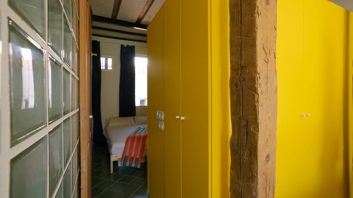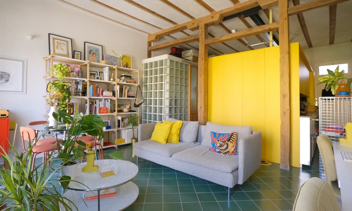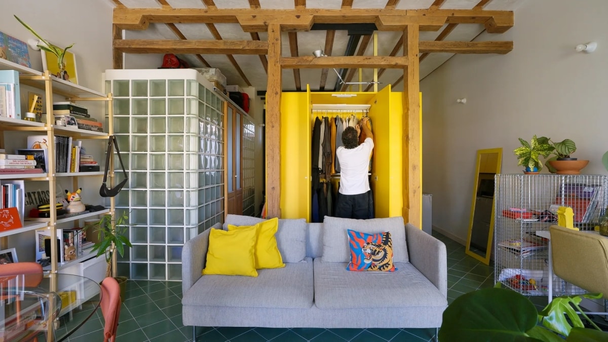 Nằm trong khu nhà tập thể kiểu cũ, không gian được cải tạo theo hướng không vách ngăn, phân tách chức năng bằng hệ tủ tích hợp và khối kính kết hợp màu sắc nổi bật.