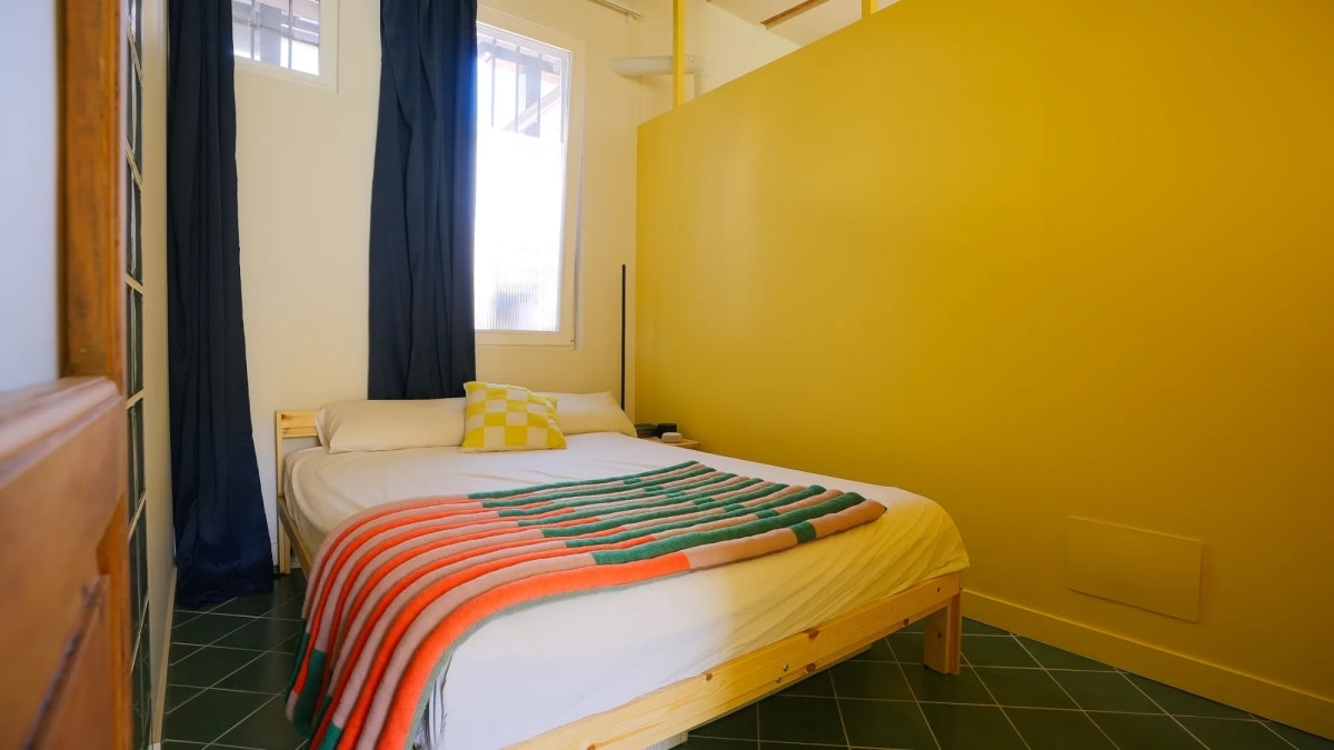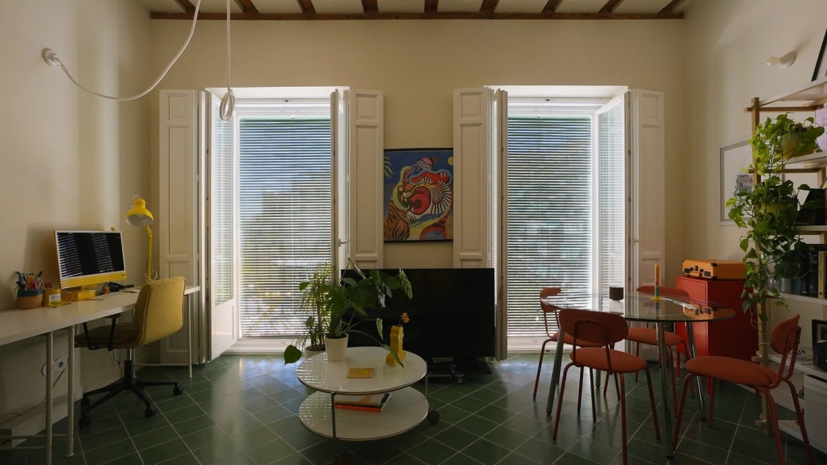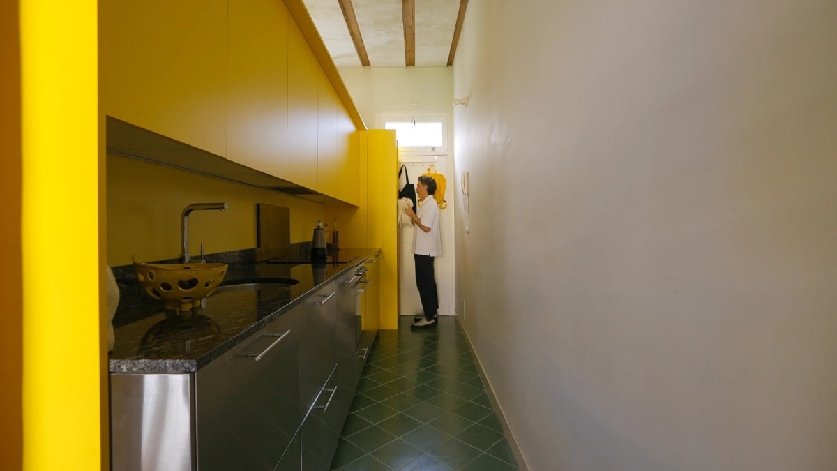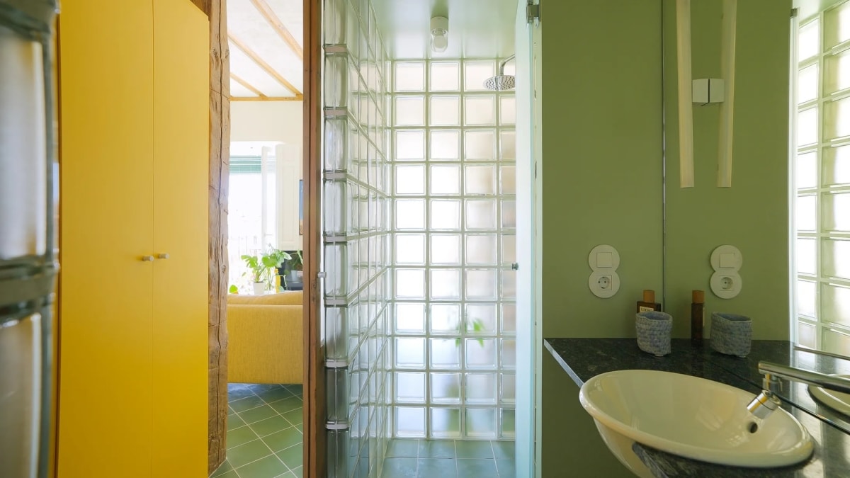 Nằm trong khu nhà tập thể kiểu cũ, không gian được cải tạo theo hướng không vách ngăn, phân tách chức năng bằng hệ tủ tích hợp và khối kính kết hợp màu sắc nổi bật.