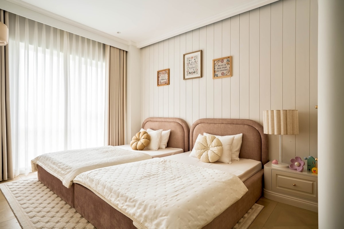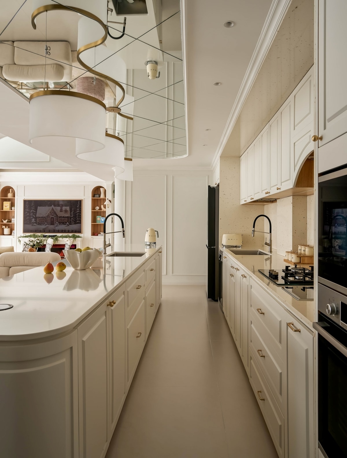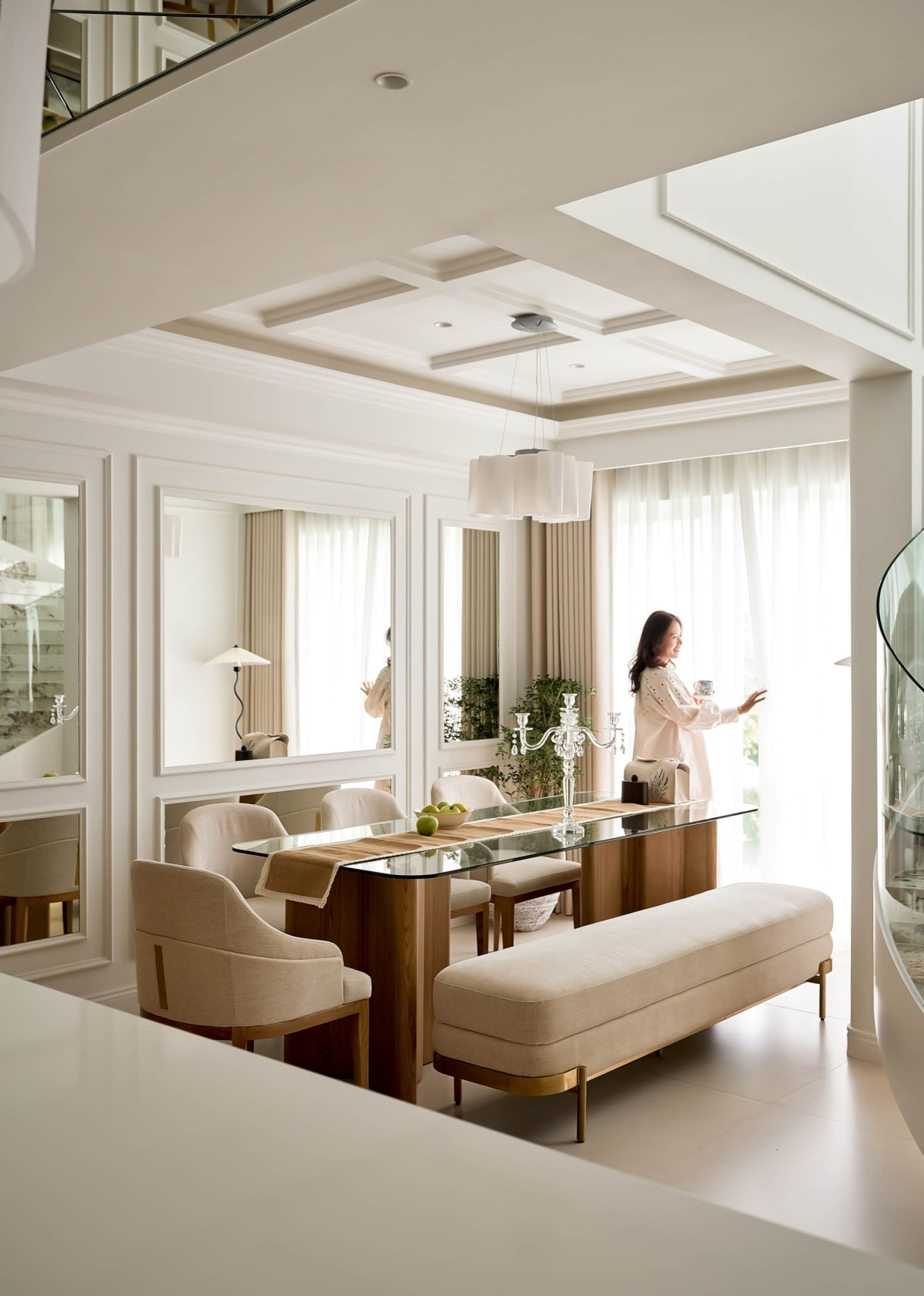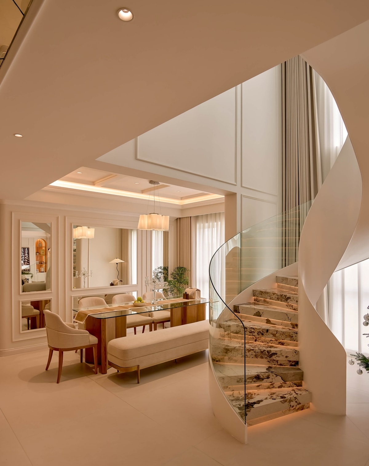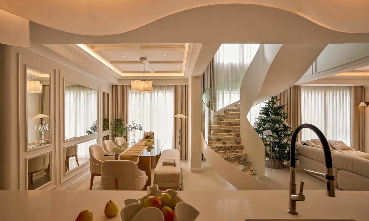 Tông trung tính kết hợp ánh sáng vàng nhẹ và bố cục mạch lạc giúp căn hộ duplex mang hơi hướng đồng quê nhưng vẫn tiện nghi theo tinh thần hiện đại.