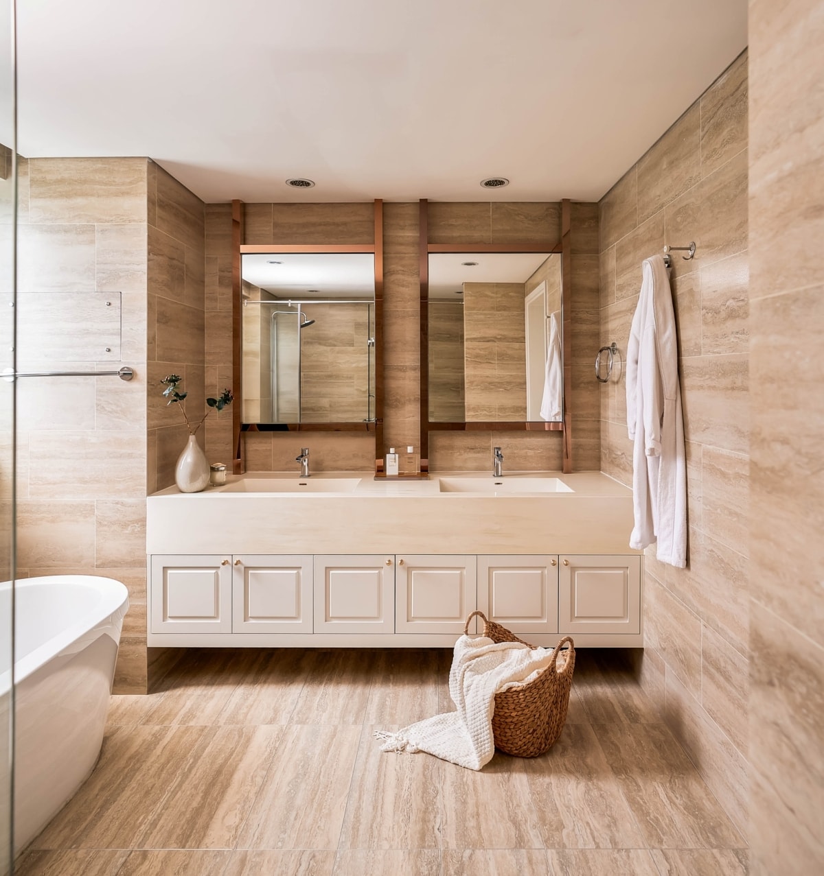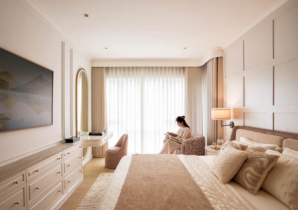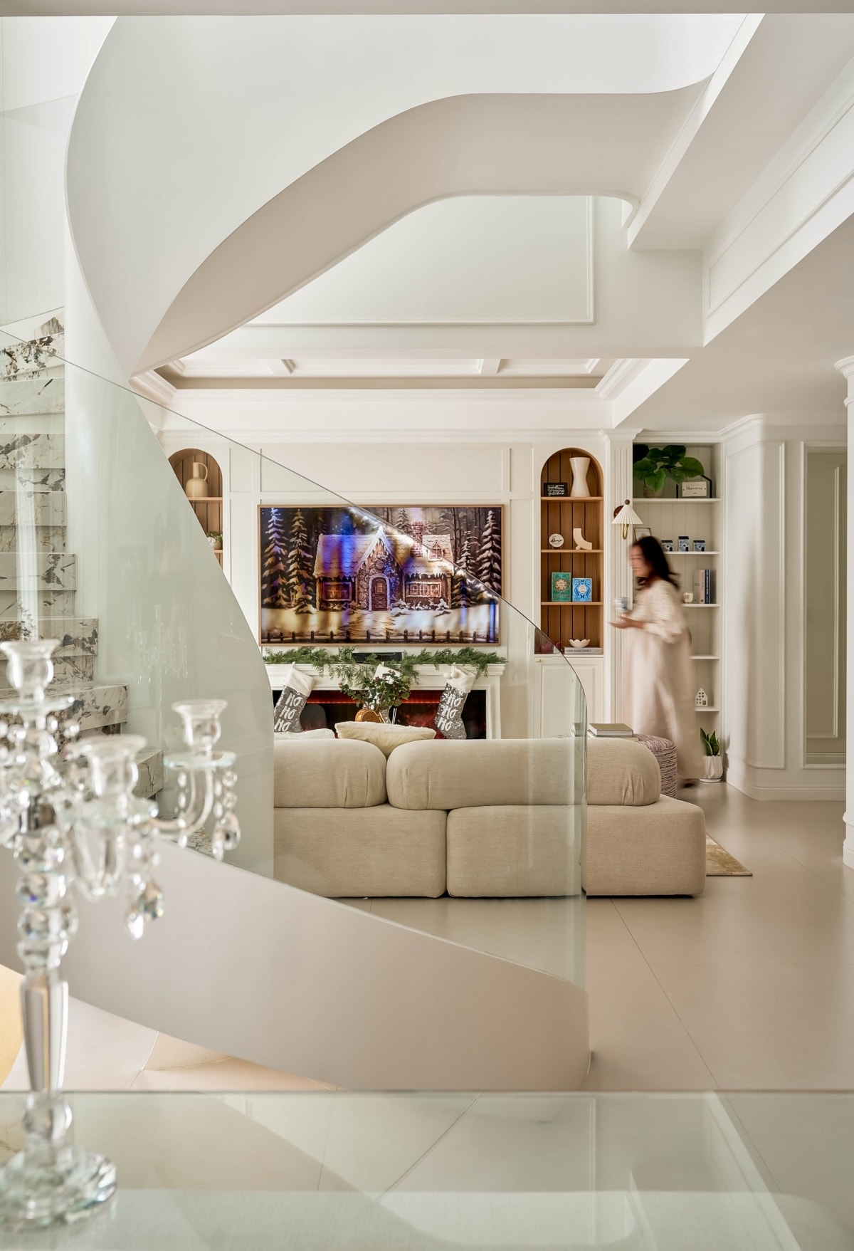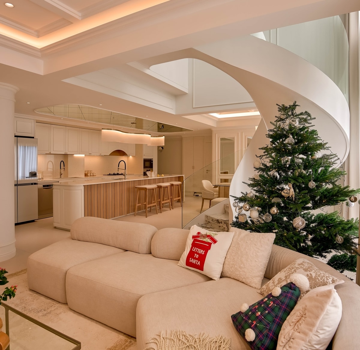 Tông trung tính kết hợp ánh sáng vàng nhẹ và bố cục mạch lạc giúp căn hộ duplex mang hơi hướng đồng quê nhưng vẫn tiện nghi theo tinh thần hiện đại.