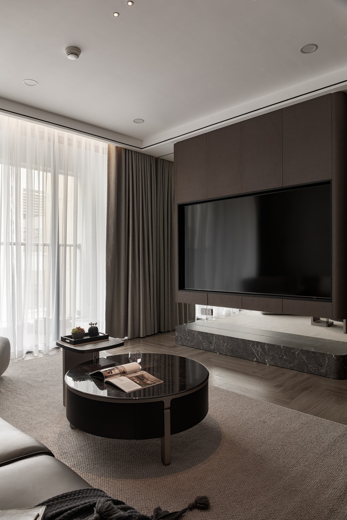 Thiết kế căn hộ tập trung vào sự gọn gàng và liền mạch, với vật liệu tối màu và nội thất phẳng, hướng đến sự chỉn chu nhưng kín đáo.