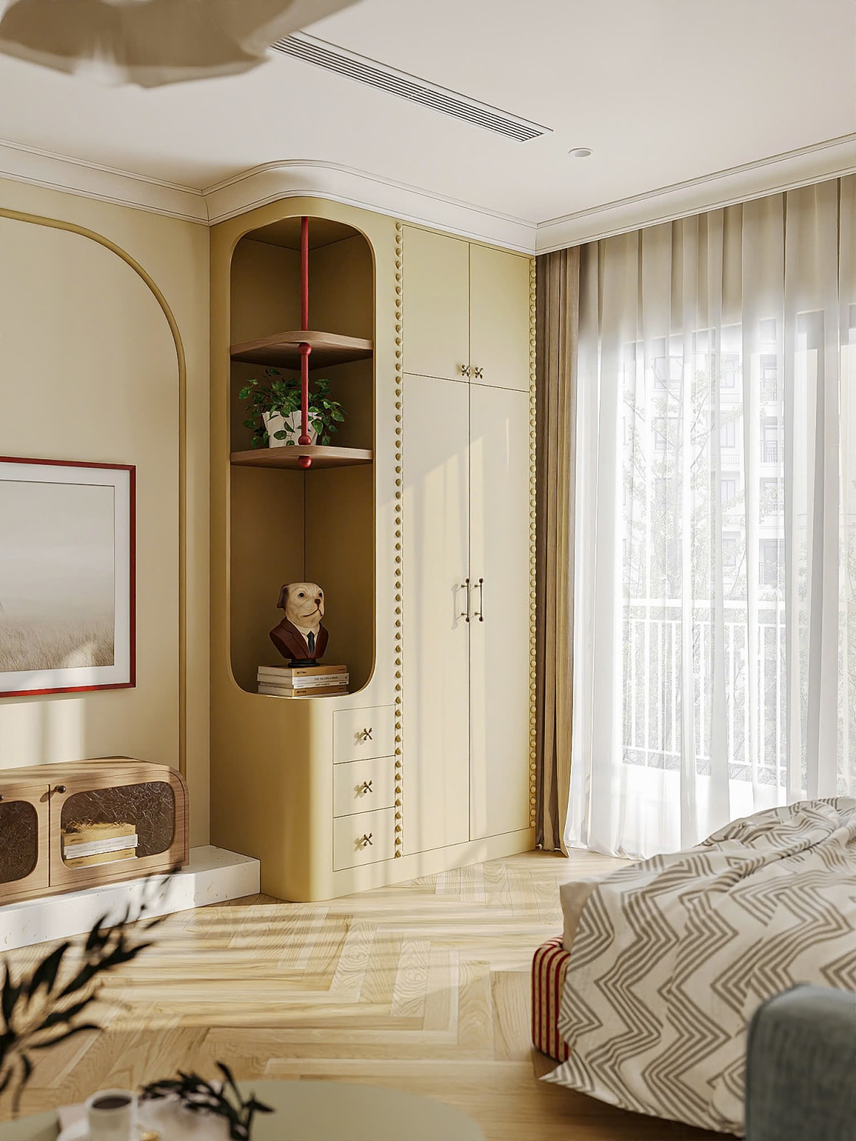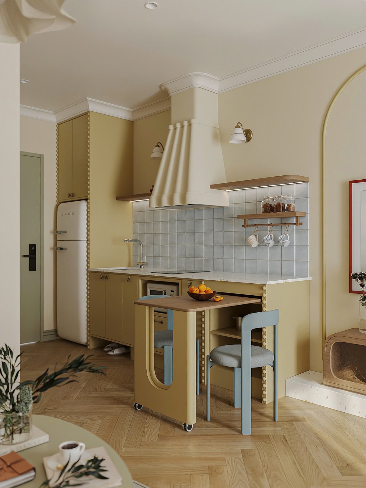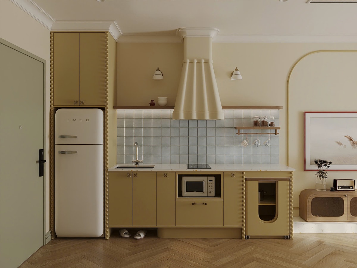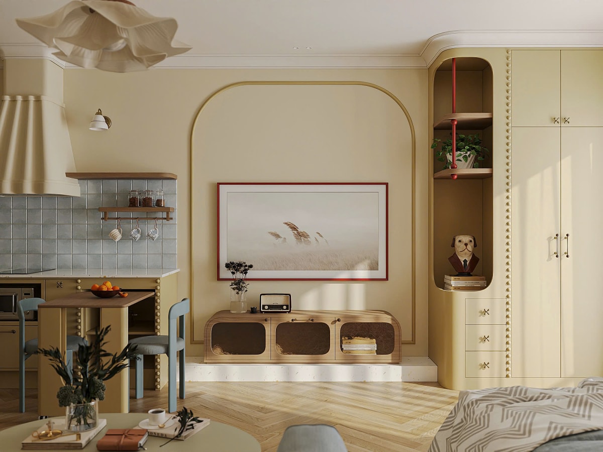Căn hộ 30 m2 lấy tông màu vàng bơ và chi tiết bo tròn làm ngôn ngữ thiết kế xuyên suốt.