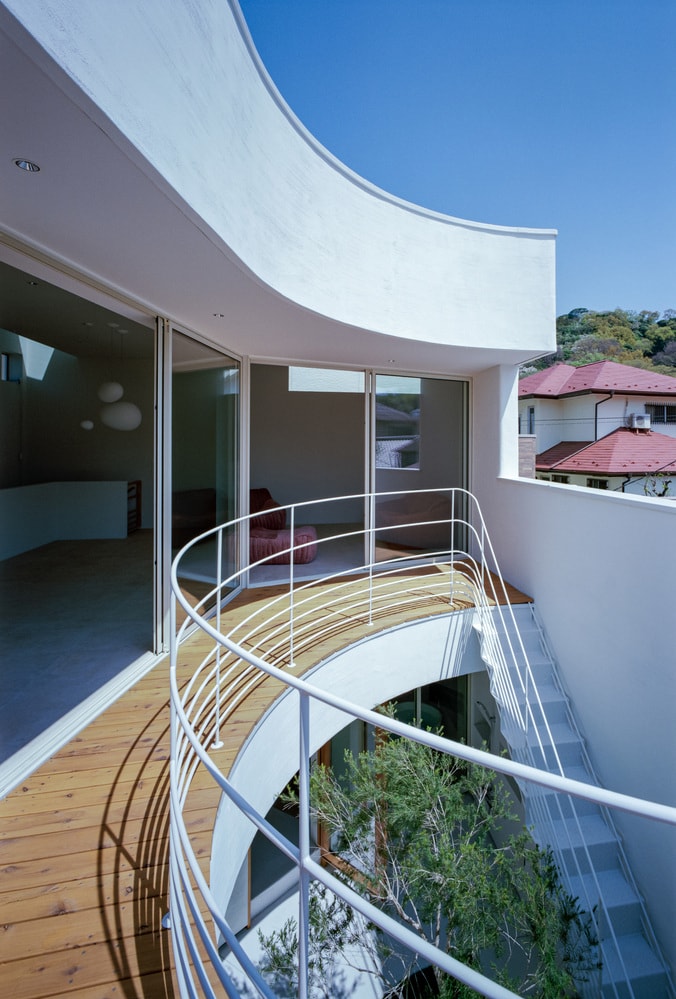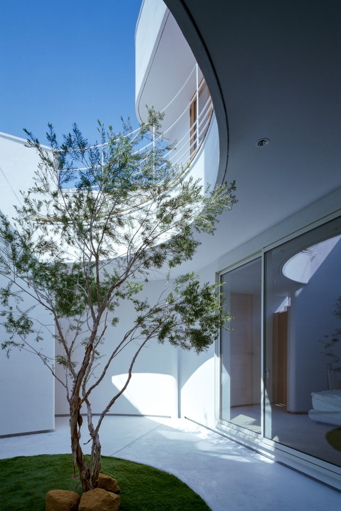 Căn nhà nằm trong khu dân cư chật hẹp, được bố trí xoay quanh khoảng sân trung tâm để tận dụng ánh sáng và kết nối các tầng.