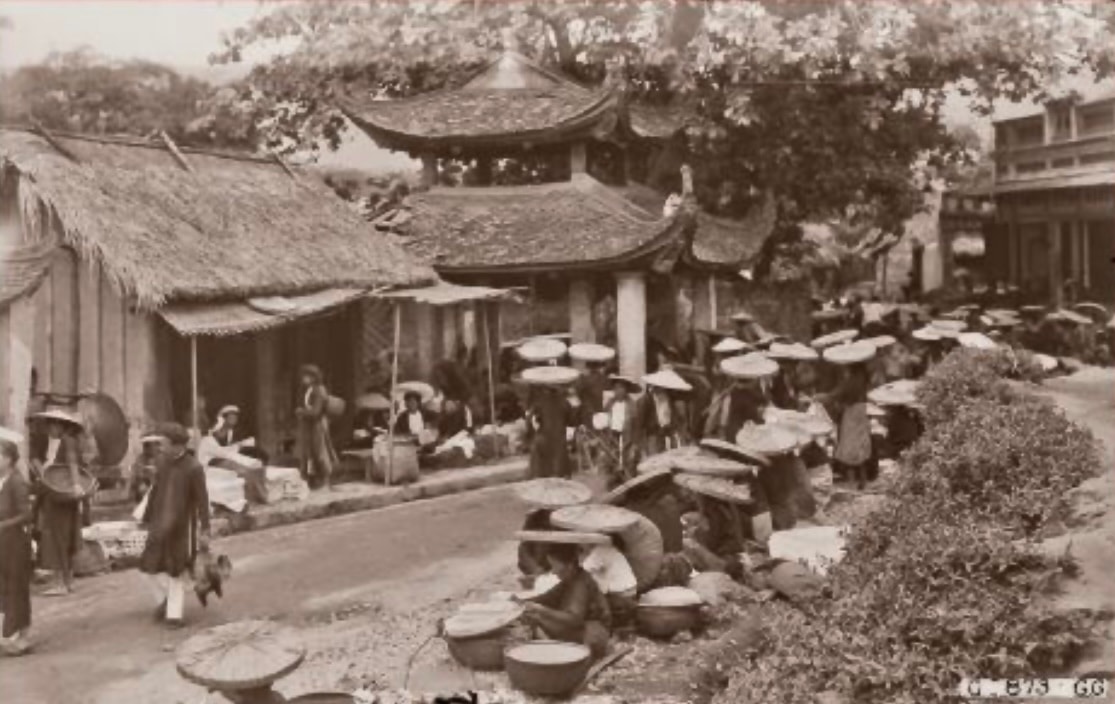 Chợ Bưởi trong một ngày họp phiên năm 1926. Chợ thuộc làng Yên Thái, mỗi tháng sẽ họp sáu phiên vào các ngày 4, 9. Ảnh: Trung tâm Lưu trữ Quốc gia I sưu tầm