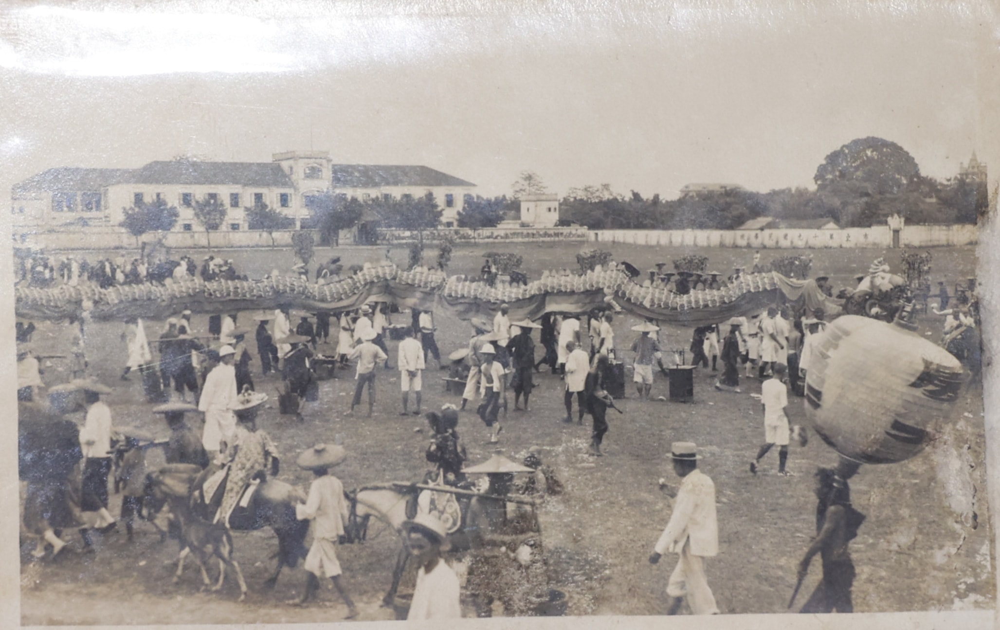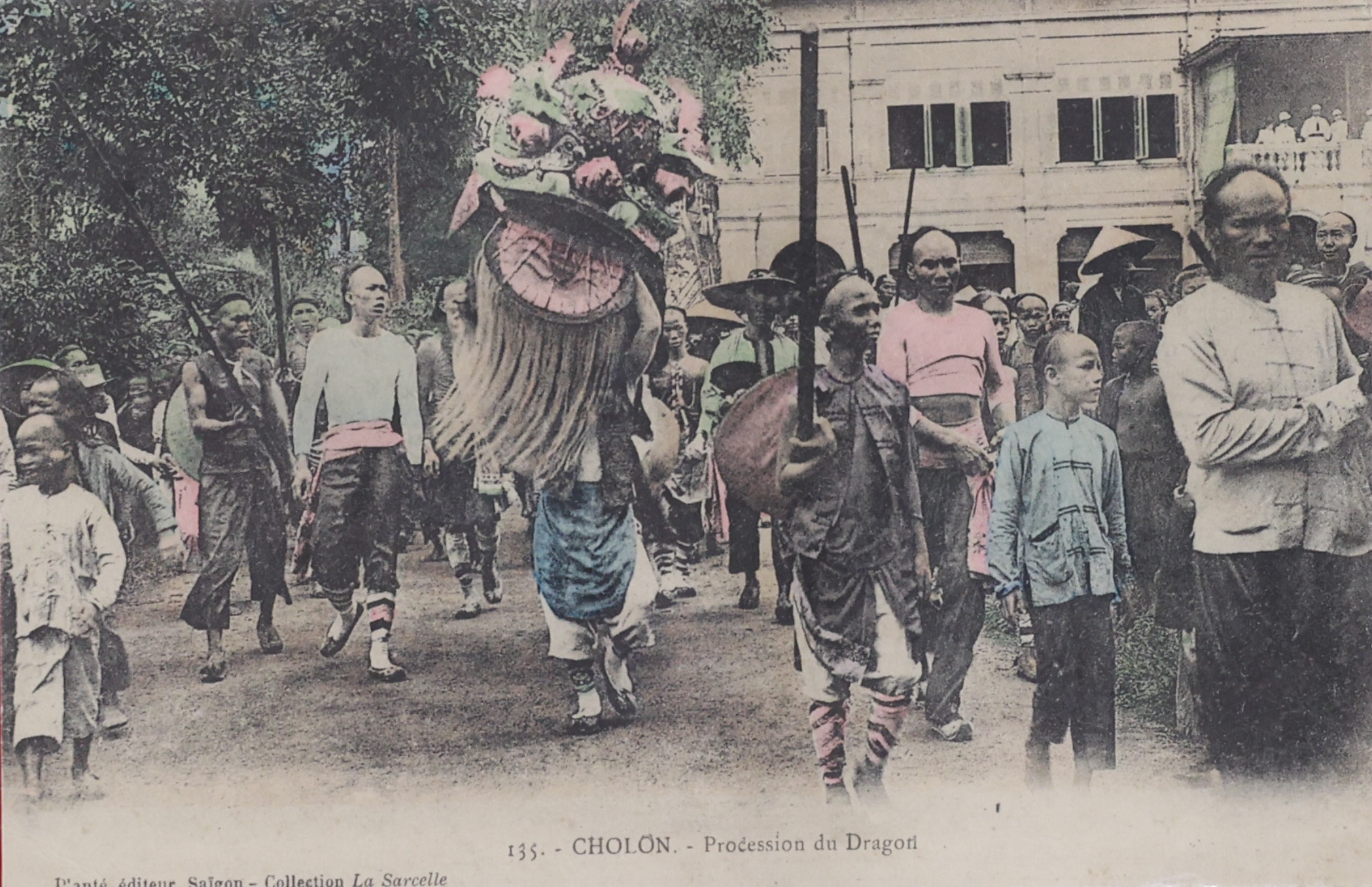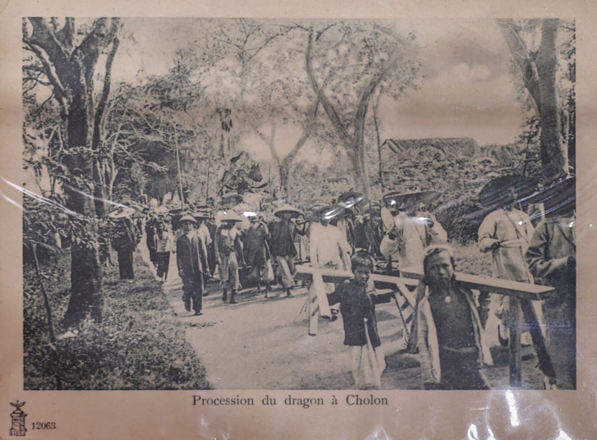 Một lễ rước rồng ở Chợ Lớn khoảng năm 1900 - 1910. Đám rước thu hút đông đảo người dân hai bên đường, phản ánh sinh hoạt lễ hội sôi động của cộng đồng người Hoa thời thuộc địa.