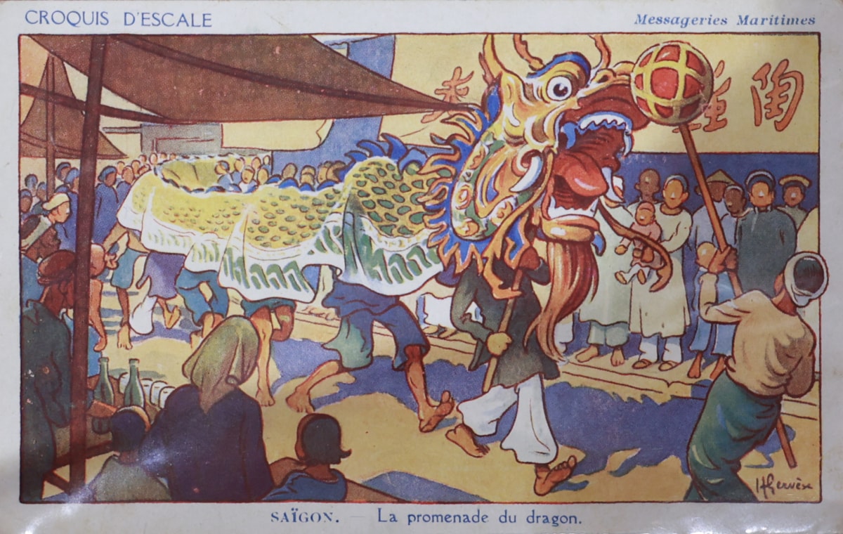 Hình vẽ khắc họa cảnh múa rồng trên đường phố Sài Gòn vào đầu thế kỷ 20, của họa sĩ Henri Gervese. Ảnh được in trong tấm bưu ảnh mà ông Hùng Lộc sưu tập được.